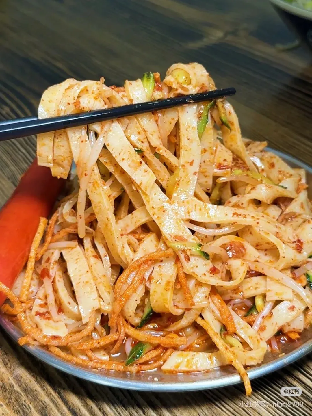 临近中午,气温升了上来。春天的正午一热,胃口就开始变。我们在镇口找了一家本地人扎堆的小吃摊。我一直有个根深蒂固的习惯:谁大晚上吃凉皮面皮啊?这东西就得是正午天热的时候吃才对味。点了三碗苏北特色的手工擀面皮,切得宽厚,拌上浓郁的蒜汁和炸得焦香的辣椒油。面皮入口劲道弹牙,带着一股纯粹的麦香,几口下肚,鼻尖冒汗,舒坦。