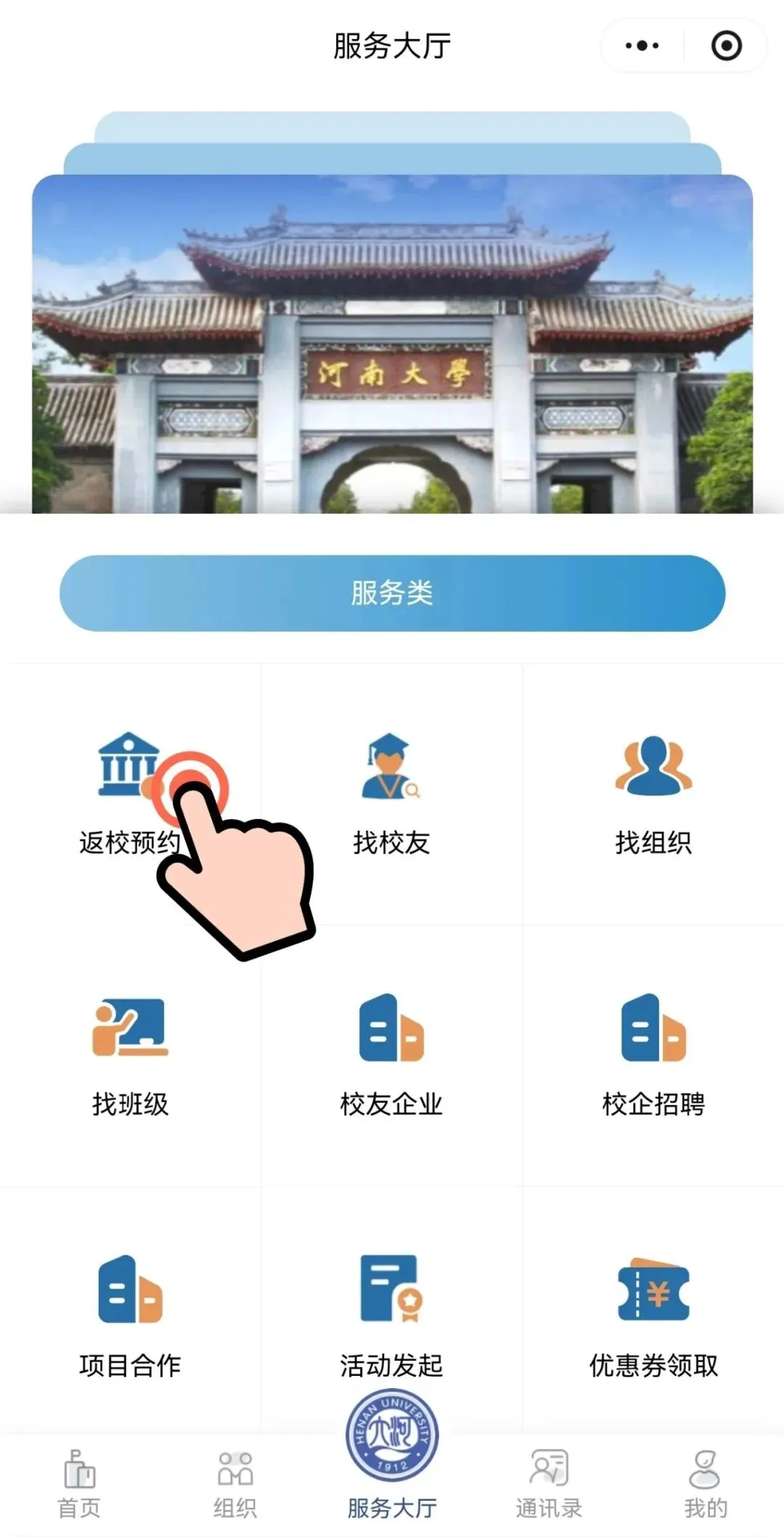 进入「河南大学校友社交服务平台小程序」选择「返校预约」。