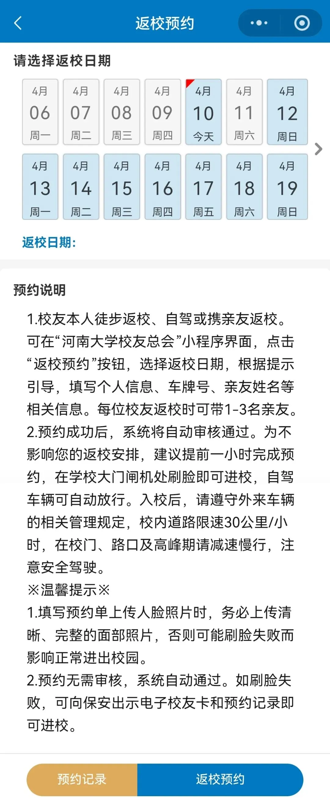 详细阅读预约说明后,选择想要返校的日期,点击返校预约。