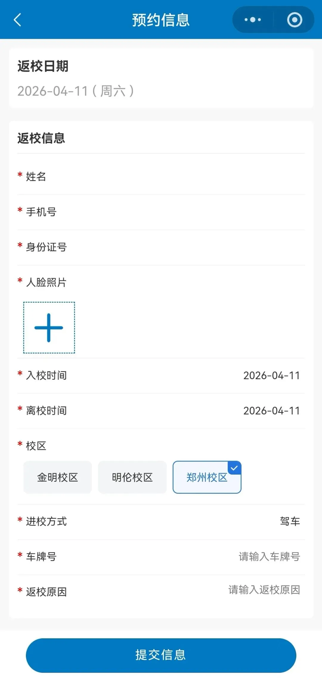 填写个人信息、返校事由、随行人员(最多3名)及车牌号等信息。请根据系统提示,上传一张清晰的个人正面免冠照片,用于人脸识别核验。