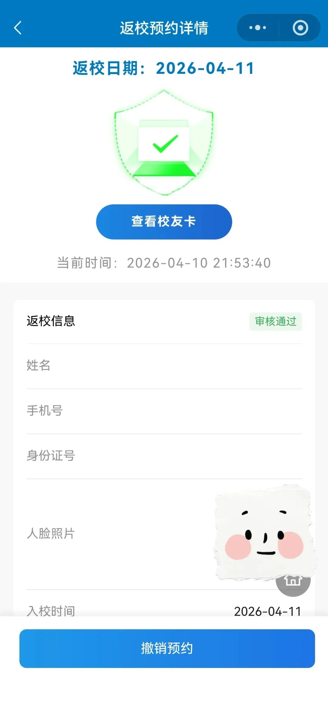 提交信息后,系统将自动进行审核。您可在小程序内查看预约记录,审核通过后即可刷脸入校。