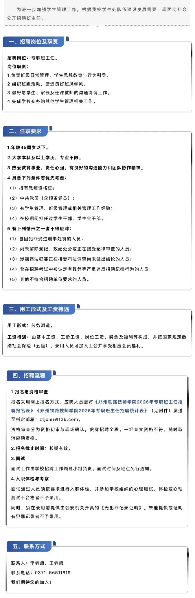 郑州铁路技师学院专职班主任招聘公告