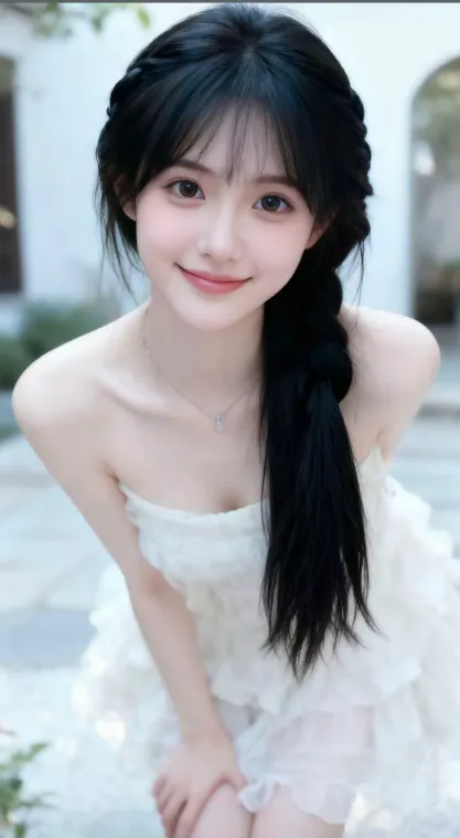 她穿着一件奶白色的抹胸蛋糕裙,层层叠叠的蕾丝裙摆软乎乎地铺开,衬得肩颈线条愈发纤细优美,锁骨在阳光下泛着淡淡的光泽。纤细的脖颈上,一条细巧的银链吊坠轻轻晃动,添了几分灵动的仙气。她就那样微微俯身,手肘搭在膝盖上,歪着头朝你笑,指尖轻轻搭在腿上,连抬手撩开碎发的小动作,都软得让人心尖发颤。