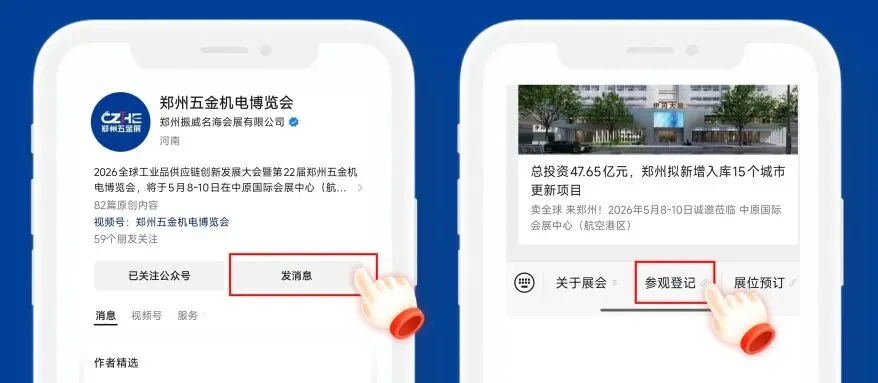关注微信公众号“郑州五金机电博览会”,点击“发消息”→ “参观登记”,根据提示填写相关信息,点击提交即可。