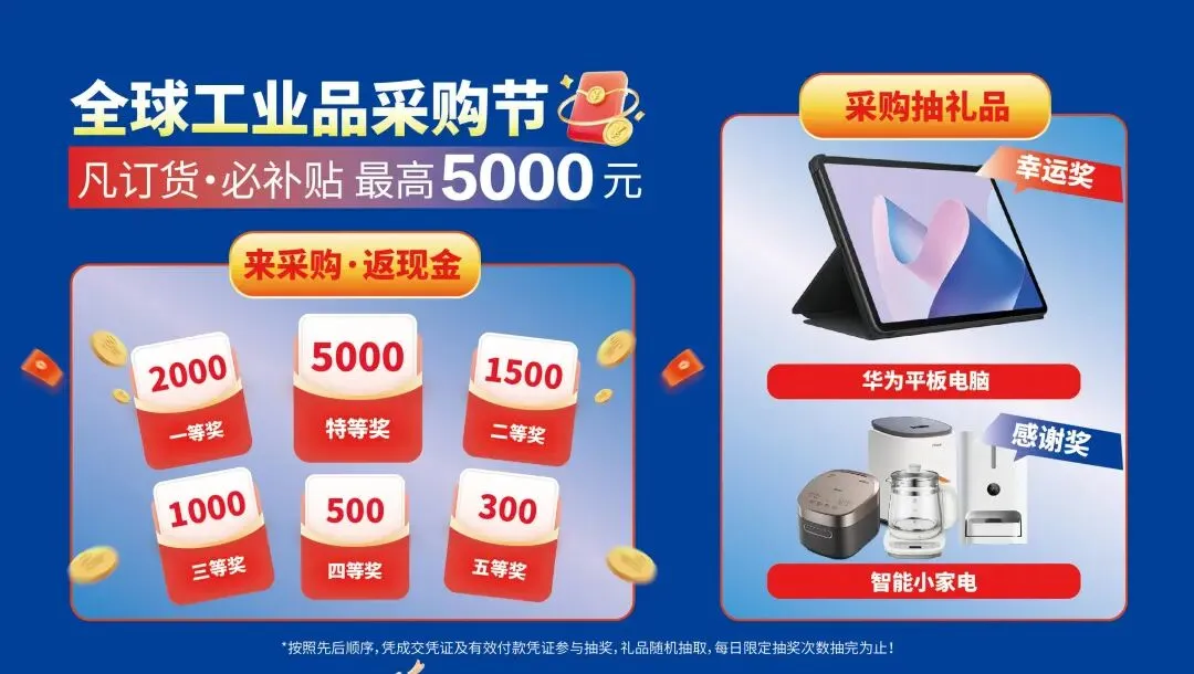 “2026全球工业品采购节”将延续往届辉煌,在订货补贴现金、订货抽礼品等经典活动的基础上,大幅升级福利体系。不仅扩充了奖项数量和中奖名额,将以更丰富的活动形式、更诱人的优惠力度,为采购商们带来前所未有的采购体验。