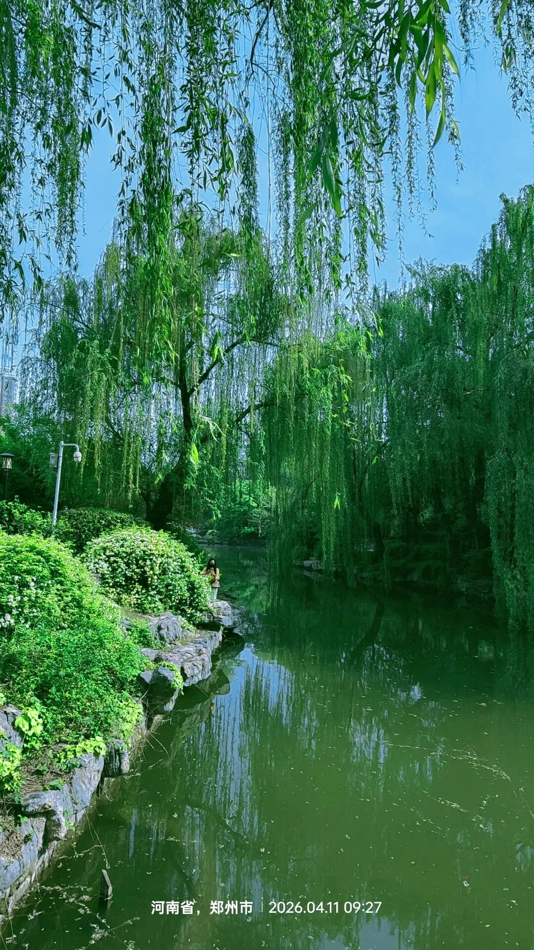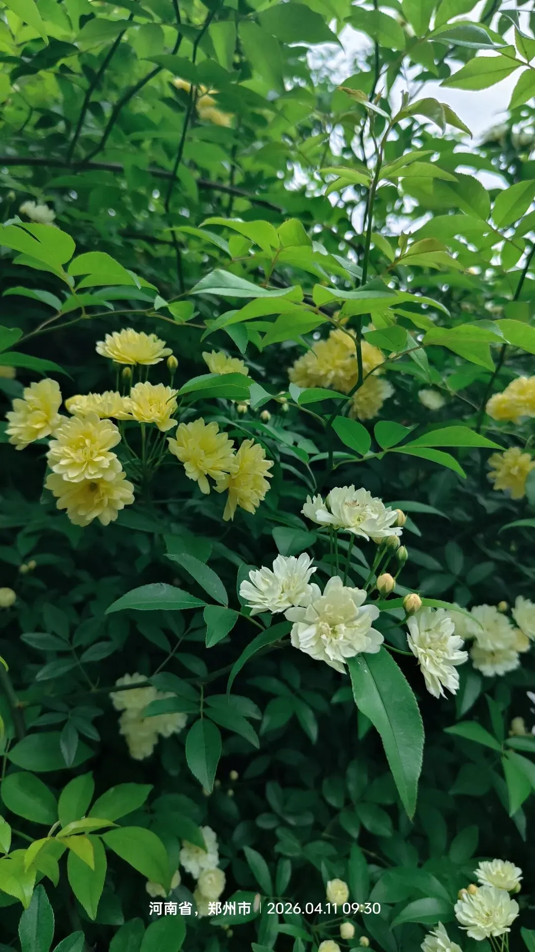 沿着公园南边的人工河缓缓漫步,不曾想,竟撞进了另一番热烈的春日盛景,所有的失落都在顷刻间被惊喜取代。河流两岸,白木香与黄木香肆意绽放,花藤顺着河岸蔓延,织成一片连绵的花瀑。洁白与嫩黄的小花簇拥在一起,繁密而热烈,清风拂过,细碎的花朵轻轻摇曳,清甜的香气随风弥漫,沁人心脾。嫩绿的垂柳依河而立,柔软的枝条随风轻摆,柳丝与木香花瀑相互映衬,一绿一黄一白,勾勒出四月最灵动的春之轮廓,满眼都是盎然的春意。