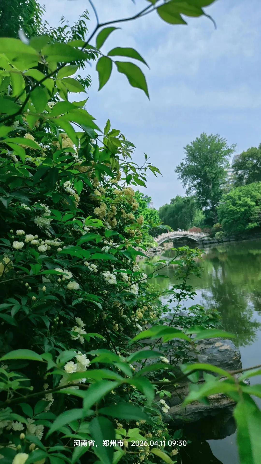 沿着公园南边的人工河缓缓漫步,不曾想,竟撞进了另一番热烈的春日盛景,所有的失落都在顷刻间被惊喜取代。河流两岸,白木香与黄木香肆意绽放,花藤顺着河岸蔓延,织成一片连绵的花瀑。洁白与嫩黄的小花簇拥在一起,繁密而热烈,清风拂过,细碎的花朵轻轻摇曳,清甜的香气随风弥漫,沁人心脾。嫩绿的垂柳依河而立,柔软的枝条随风轻摆,柳丝与木香花瀑相互映衬,一绿一黄一白,勾勒出四月最灵动的春之轮廓,满眼都是盎然的春意。