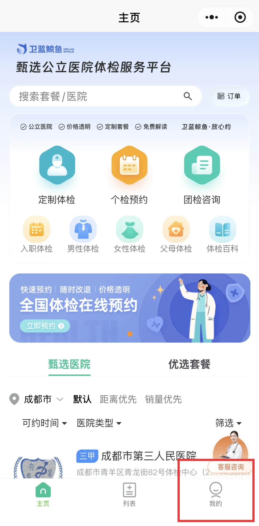 注:本渠道仅支持通过【卫蓝鲸鱼健康体检平台】预约的订单。