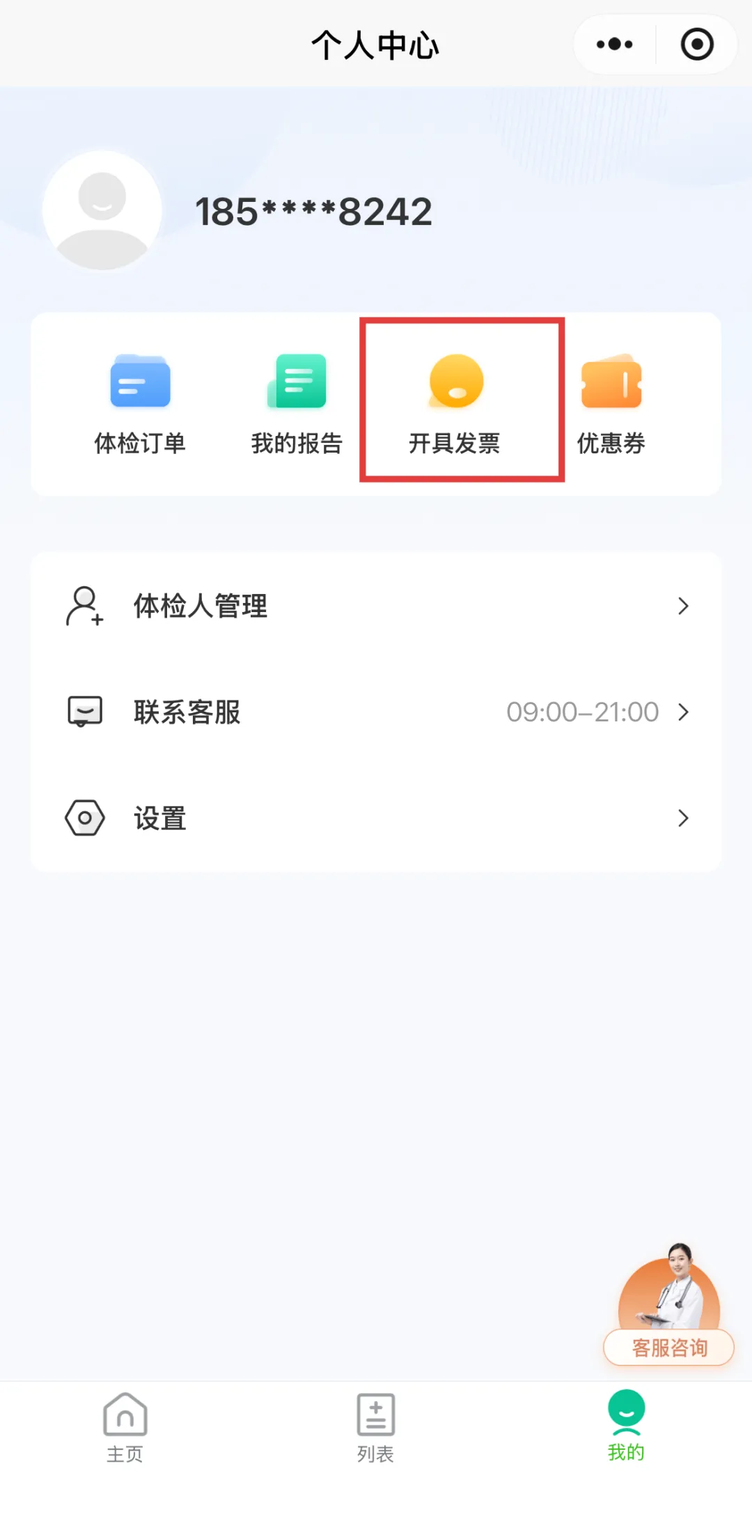 进入【卫蓝鲸鱼体检预约】小程序,点击【我的】,点击【开具发票】,填写相关开票信息提交即可。