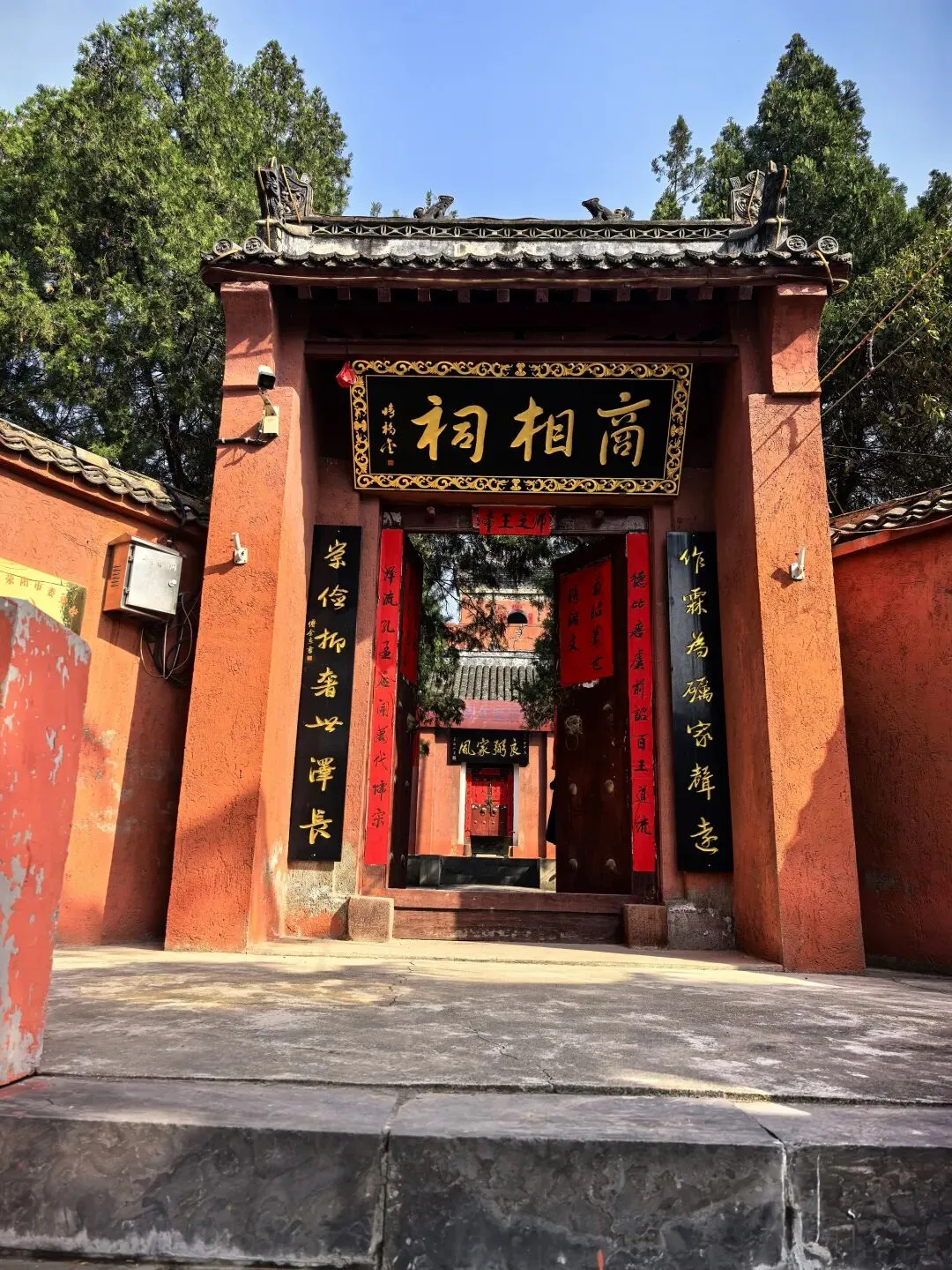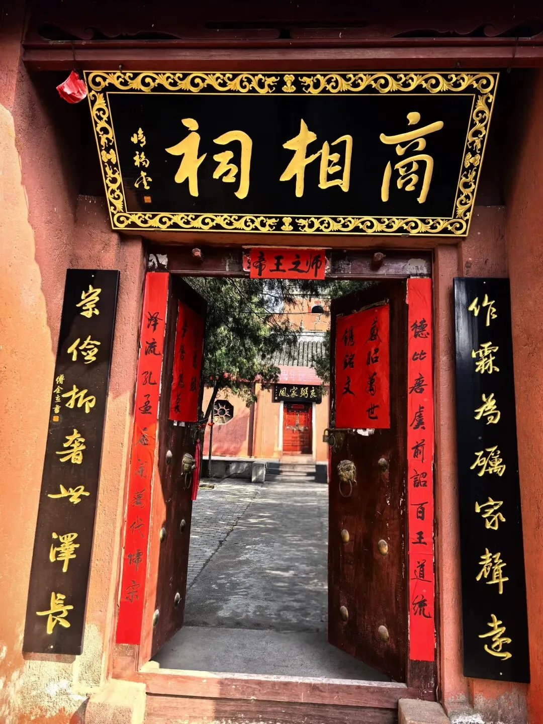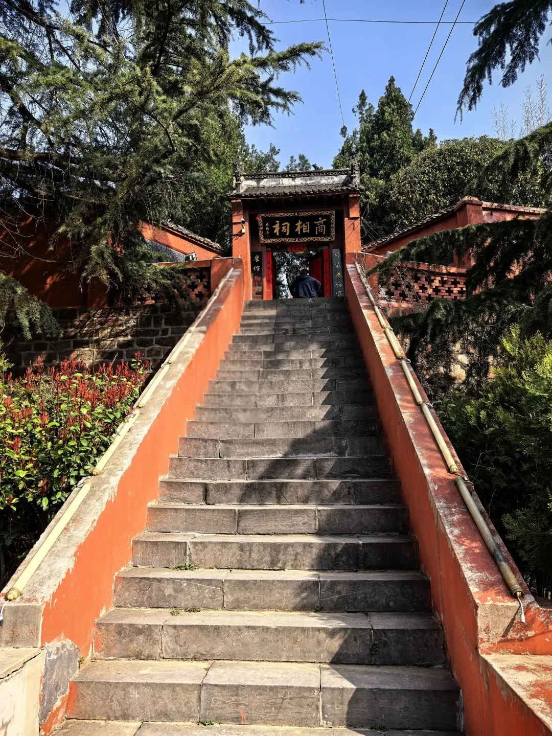 牌坊正中刻着《傅說故里》四个大字,一眼就点明了这里的身份——3000多年前商代名相傅说的老家。四根立柱上的楹联,更是把傅说辅佐武丁、开创殷商盛世的功绩写得明明白白。顺着牌坊往里走,红墙古祠就在眼前,瞬间就把人拉进了千年历史的氛围里。穿过牌坊,就到了这条长长的登山台阶。青石板铺就的台阶,两侧是朱红的墙垣,扶手顺着山势延伸,爬起来不费劲。顺着台阶往上走,抬头就能看见山门匾额上「商相祠」三个大字,一步一景,越往上越有仪式感,仿佛在一步步走近3000年前的先贤。这种「步步登高」的设计,既是对傅说「从奴隶到宰相」人生逆袭的呼应,也暗含着「步步高升」的美好寓意,老祖宗的设计真的太有讲究了。顺着台阶登顶,就到了商相祠的正门。朱红色的围墙、古朴的木门,瞬间就静了下来。大门上「商相祠」三个大字苍劲有力,门楣横批「帝王之师」,直接点明了傅说作为商王武丁之师的尊崇地位。两侧楹联「作霖为砺家声远,崇俭抑奢世泽长」,送用《尚书·说命》的名句,把傅氏千年家风刻在了门上。