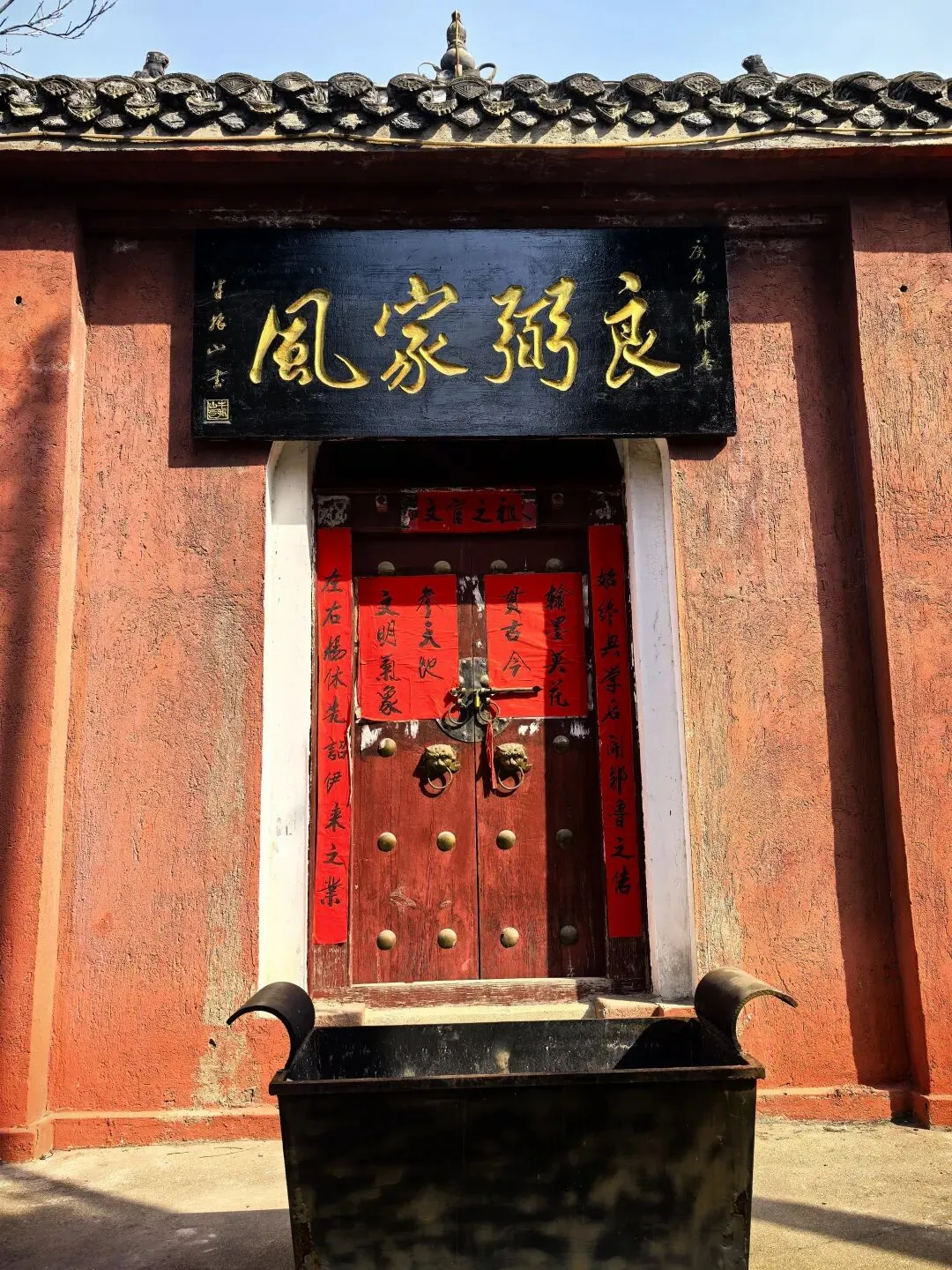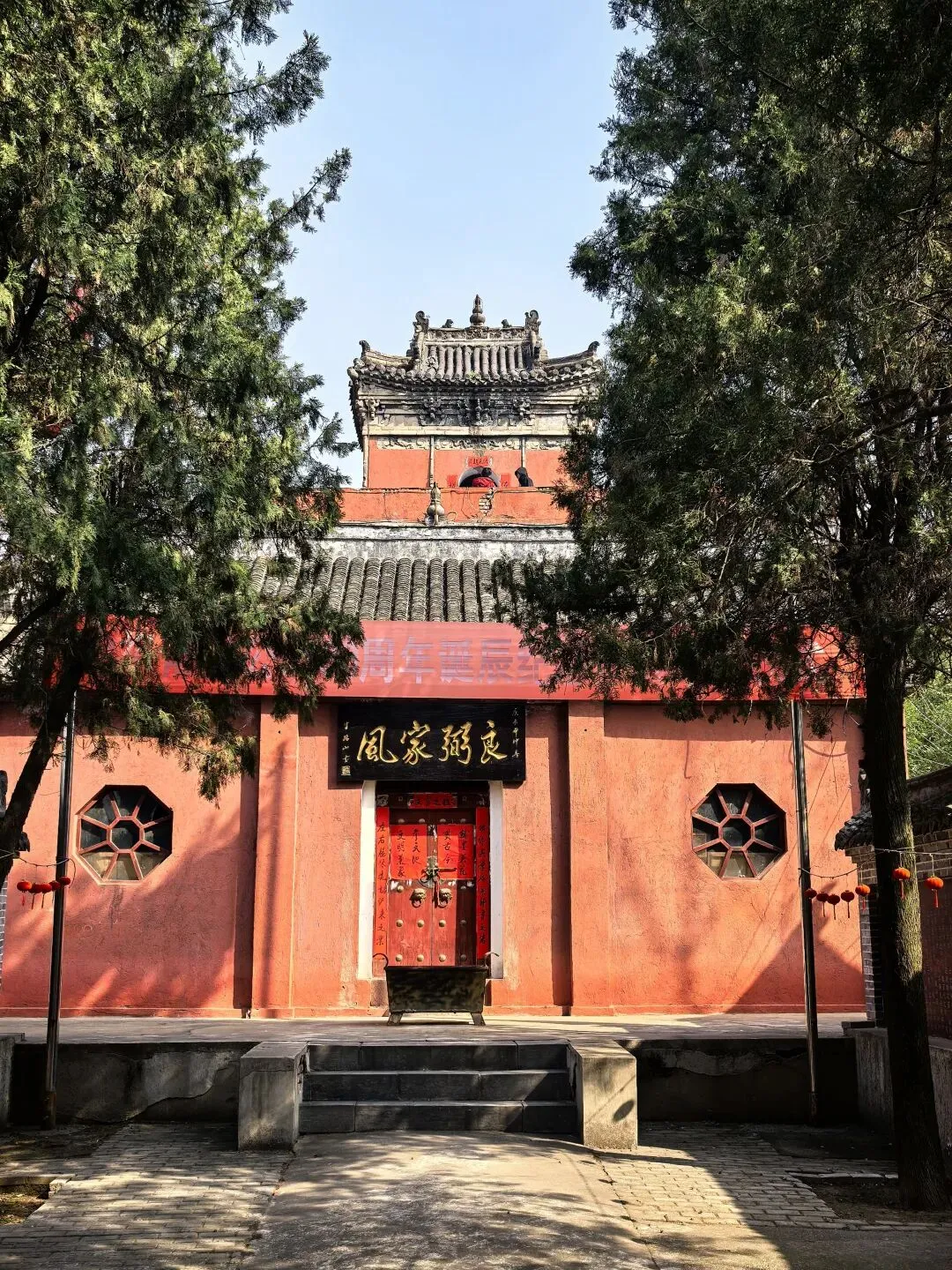 四、良弼家风:主殿藏着千年家训登顶台阶,迎面就是商相祠的主殿,这也是整座祠庙的核心。红墙黛瓦,古柏掩映,殿门两侧的八角花窗透着古朴雅致,檐下的砖雕斗拱工艺精湛,尽显中原古建的韵味。殿门口的香炉常年烟火不断,是傅氏后裔和游客祭拜先贤的地方。