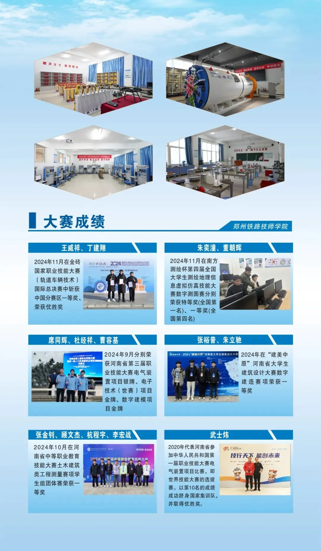 郑州铁路技师学院建有220多个多媒体教室,有1000余台高配置的计算机。建有电气安装、低压电工、机电一体化、盾构设备操作、焊工、混凝土、数字绘图等61个实训室;拥有全站仪、水准仪、GNSS、无人机等先进测量设备300余套。建有铁道电气化、铁道信号、牵引供电、铁道测量、铁道线路起重装吊、汽车驾驶、施工机械操作等十余个室外实训场所;建有舞蹈室、形体室、会计演练室、钢琴室。可满足各专业学生校内实习实训、技能鉴定及各级各类竞赛工作。