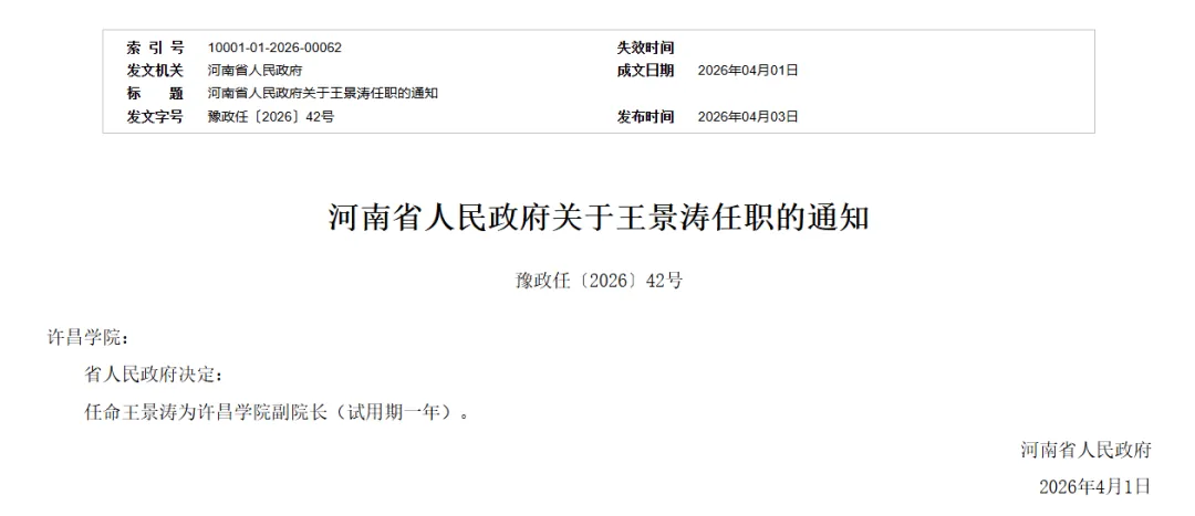 这是一篇迟到的文章。这几天,关于许昌2026年的招教引起了一些讨论,仅就这次招教而言,变化确实还是比较大的,尤其是门槛方面,可以再观察观察。近日,河南省人民政府发布了一批人事任免通知,涉及省自然资源厅、省卫生健康委、商丘师范学院、许昌学院等政府职能部门和高校。其中:任命王景涛为许昌学院副院长(试用期一年),而许昌学院的田萍教授则调任商丘师范学院副院长(此前曾任许昌学院学科建设办公室主任、研究生工作办公室主任)。关于许昌学院这位新任职的80后副院长,确实很年轻,1984年11月生人,截至目前还不到42岁,正是当干之年。学术背景也很扎实,据公开信息显示,王景涛院长本硕博均在天津大学就读,妥妥的985高材生,2003年9月至2007年7月天津大学本科学习(天津大学与南开大学合办),获天津大学工学、南开大学理学双学士学位;2007年9至2012年1月在天津大学硕博连读,导师为姜忠义教授,论文曾被评为天津市优秀博士学位论文。主要研究方向为膜与膜过程,聚焦能源和环境领域的迫切需求和重大挑战,重点围绕氢燃料电池用质子交换膜、全固态锂电池用电解质、电子级化学品用膜与膜材料开展研究。工作经历方面,王景涛院长曾长期在郑州大学工作,在郑大经历了讲师、副教授、教授等职称的晋升(2017年3月至2018年3月,阿德莱德大学访问学者,),2019年8月至2023年10月,历任郑州大学校副团委书记、校团委书记(团中央候补委员),2023年10月至2025年10月,任郑州大学化工学院党委书记;2025年10月起,任郑州大学化工学院院长,直至此番履新许昌学院副院长。学术兼职方面,曾兼任河南省化工学会副理事长、河南省化工学会青年工作委员会主任委员、中国青年科技工作者协会理事、《膜科学与技术》通讯编委会成员等。主要荣誉方面,2019年,河南省教育厅学术技术带头人;2019年,美国化学会I&EC research 2019影响力学者;2020年,中原青年拔尖人才;2020年,霍英东教育基金会高等院校青年教师奖;2021年,侯德榜化工科学技术青年奖;2022年,教育部青年长江学者……