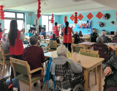 紧接着,文化活动组的同学深入各个康养区,为老人们带来了轻松愉快的康乐活动。他们耐心地教老人们学习“拍打操”,帮助长者们活络筋骨,放松身心;随后,又一起学习了简单有趣的手势舞,伴随着轻快的音乐,老人们跟着节奏舞动双手,脸上洋溢着幸福的笑容。