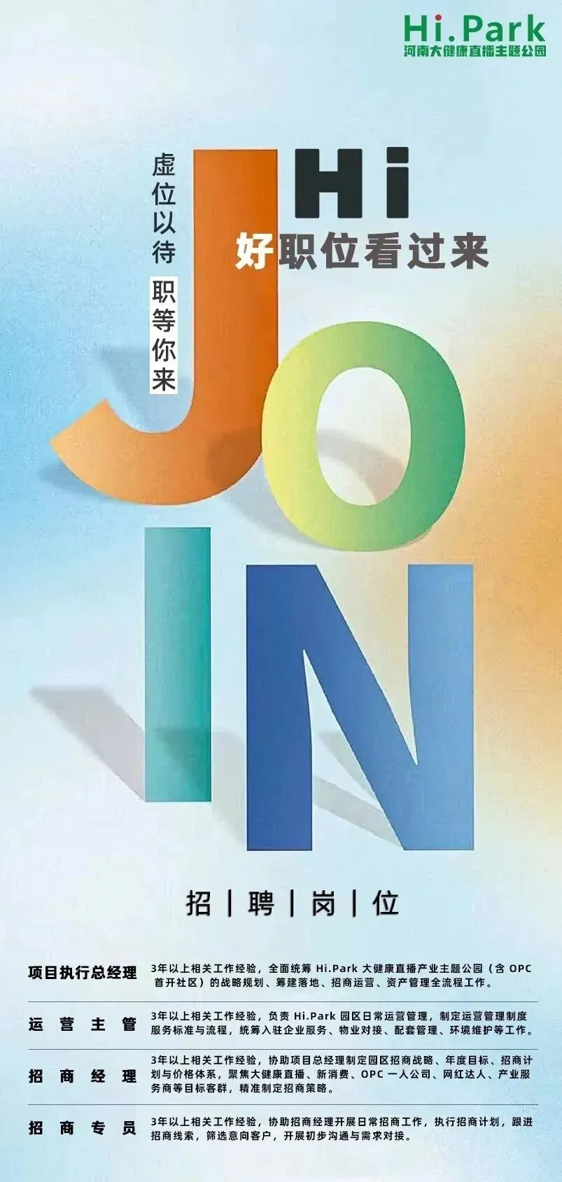 2.3年以上产业园区/ 商业地产 / 直播电商 / 大健康产业招商经验,2年以上同岗位管理经验,有产业园、孵化器、直播基地招商成功案例,熟悉OPC 模式、大健康直播产业链者优先。