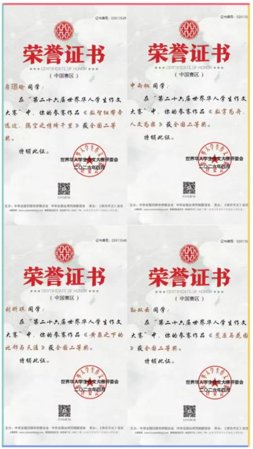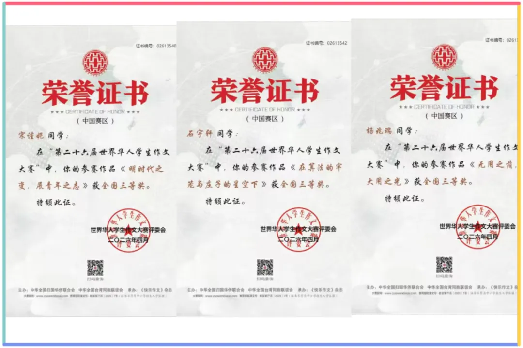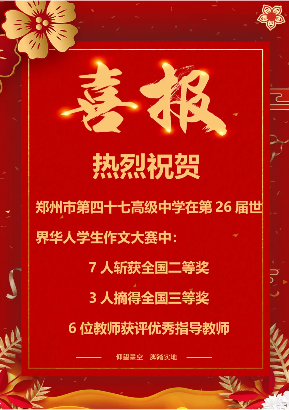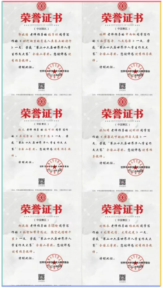 笔墨生香传文脉,佳作频出报佳音。近日,备受瞩目的第26届世界华人学生作文大赛评选结果正式揭晓。郑州市第四十七高级中学学子在此次高手如云的赛事中表现优异,凭借扎实的文学功底和独特的创作视角脱颖而出,共有10名学子荣获国家级奖项。其中,7人斩获全国二等奖,3人摘得全国三等奖,6位教师获评优秀指导教师,充分展现了学校语文教学的丰硕成果和四七学子的人文风采。