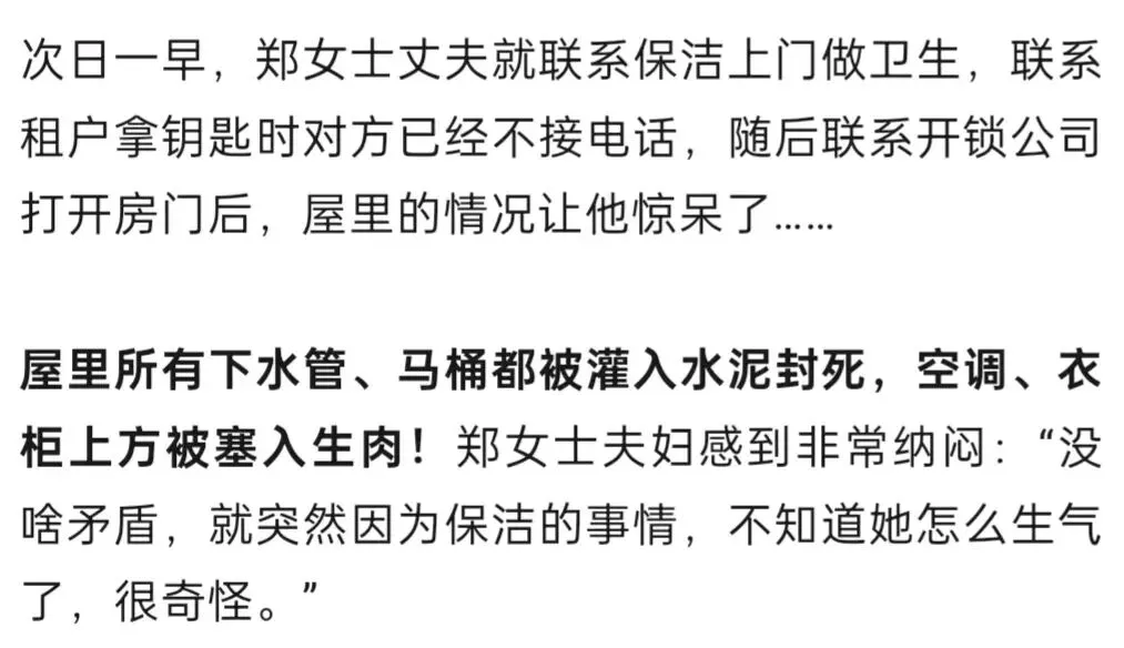 >河南郑州一房东称收房时家中7个下水管、马桶都被灌入水泥堵死,柜子上还放有生肉!曾告知租客找保洁,否则扣押金;律师解读→