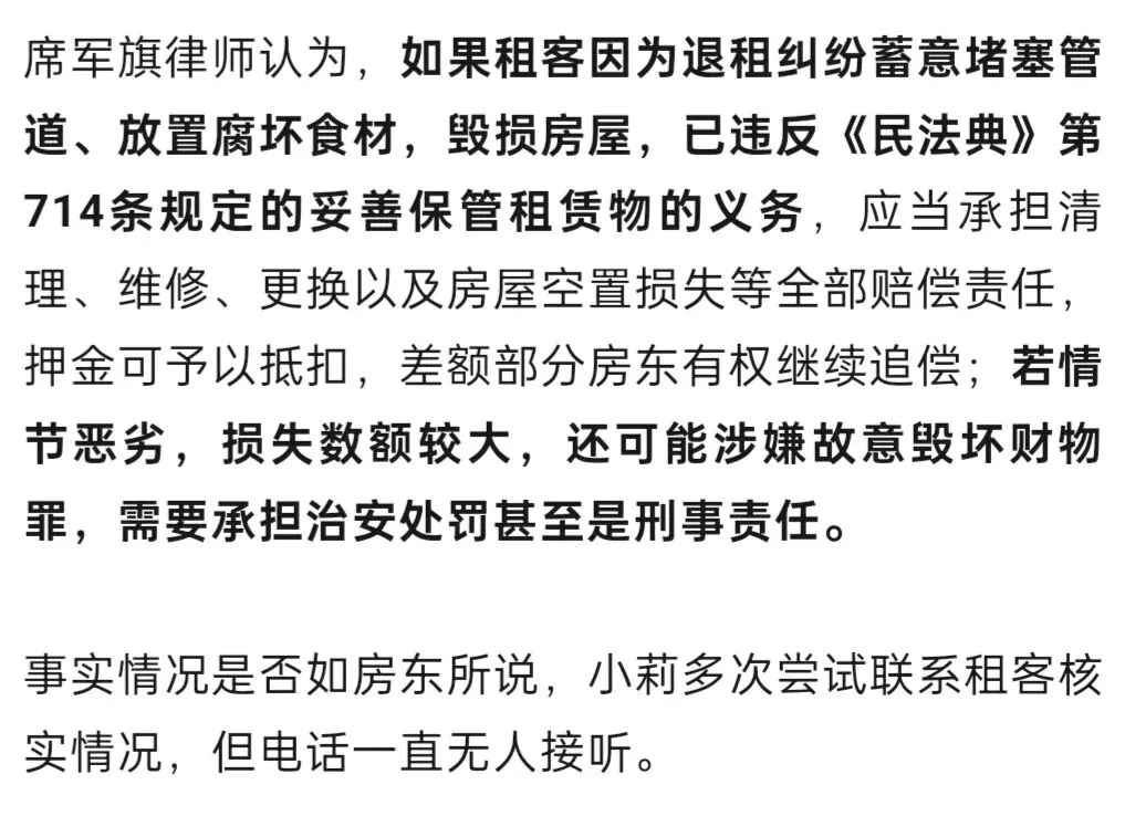 房东称,目前疏通管道已经花了两千多,后续马桶可能还需要更换,但租户一直联系不上。