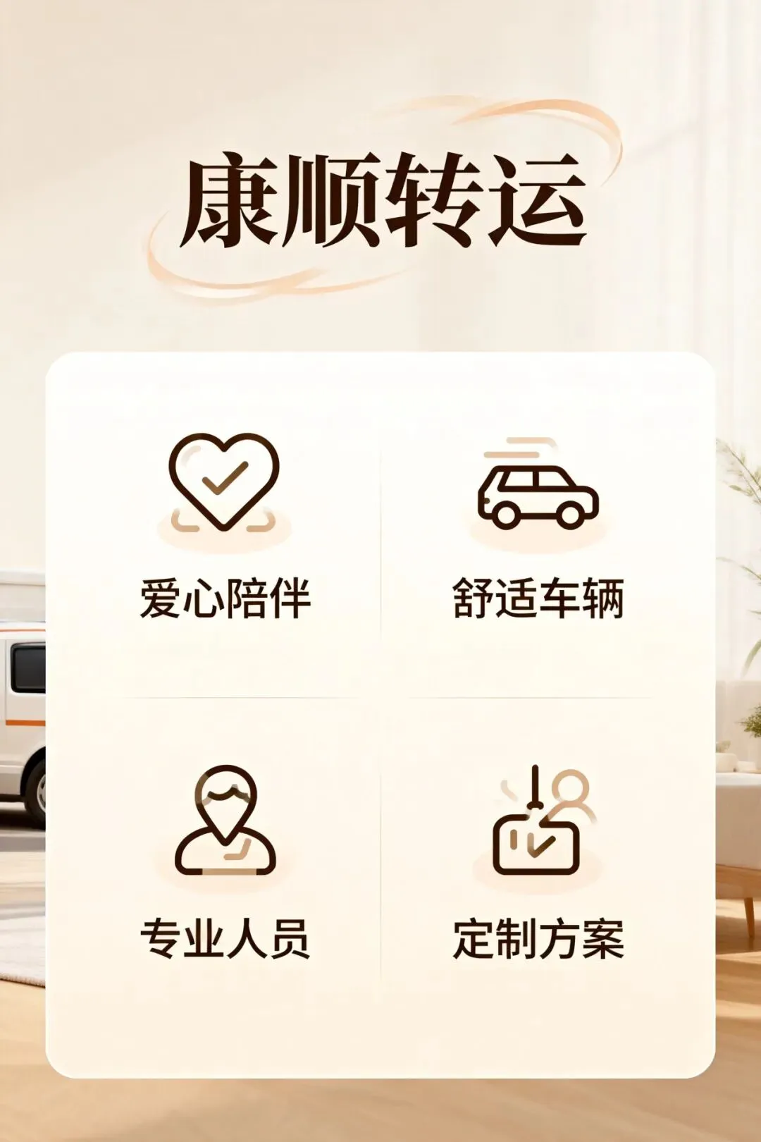 康顺转运专注各类非急救医疗护送,服务范围涵盖市内转院出院、跨省长途、机场车站接送、港澳跨境与国际包机转运,同时提供活动赛事保障、患者返乡、安宁转运等服务。24小时响应,快速出车,全程专业陪护。如需帮助,请拨全国24小服务热线:4000062120,微信客服:18613127331(长按复制添加咨询),我们即刻出发。