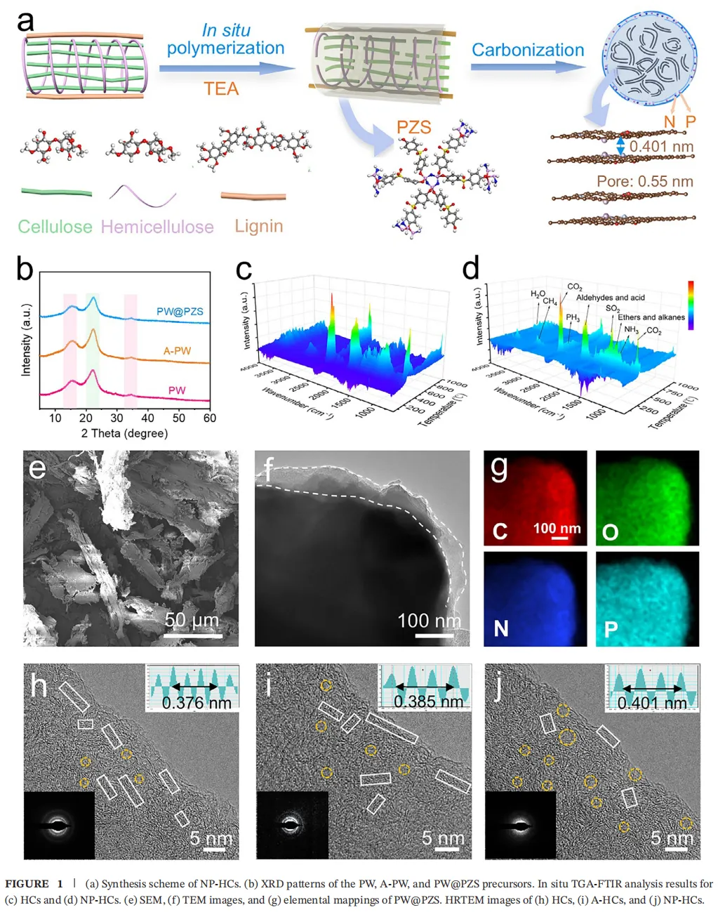 解决方案:作者提出了一种巧妙的“原位转化碳化策略”,利用聚磷腈(PZS)共形涂覆在杨木前驱体上,并引入三乙胺(TEA)发挥“一石二鸟”的作用(既促进聚合又提取木质素修饰前驱体),成功合成了表面低浓度N, P掺杂的高性能硬碳(NP-HCs)。