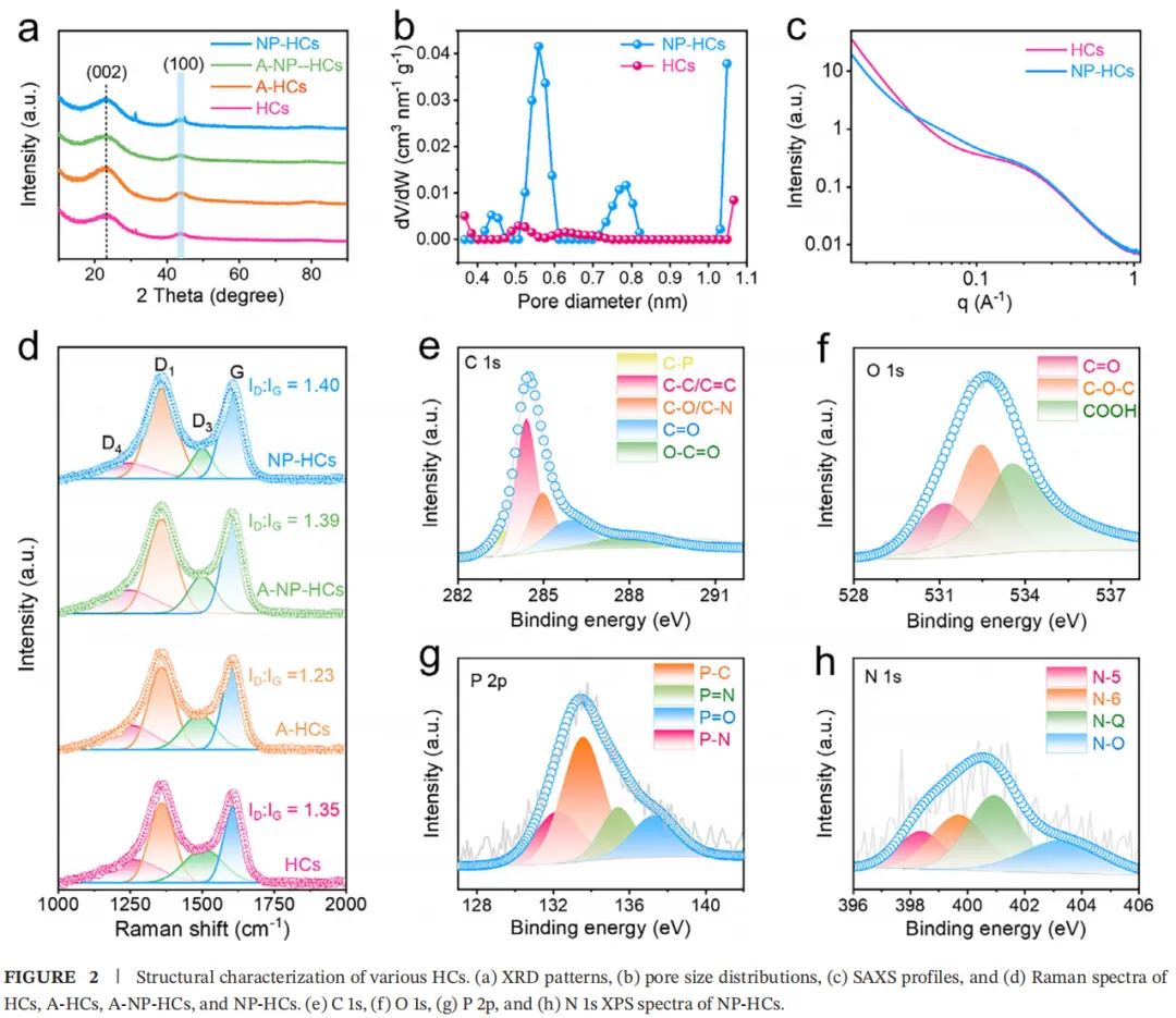 证据一(XRD、SAXS与孔径分析):探测了材料的体相结构。结果显示,NP-HCs的层间距被显著撑开至0.401 nm,且SAXS证实闭孔尺寸和体积大幅增加。这为钠离子的无障碍穿梭和海量存储提供了“大别墅”。
