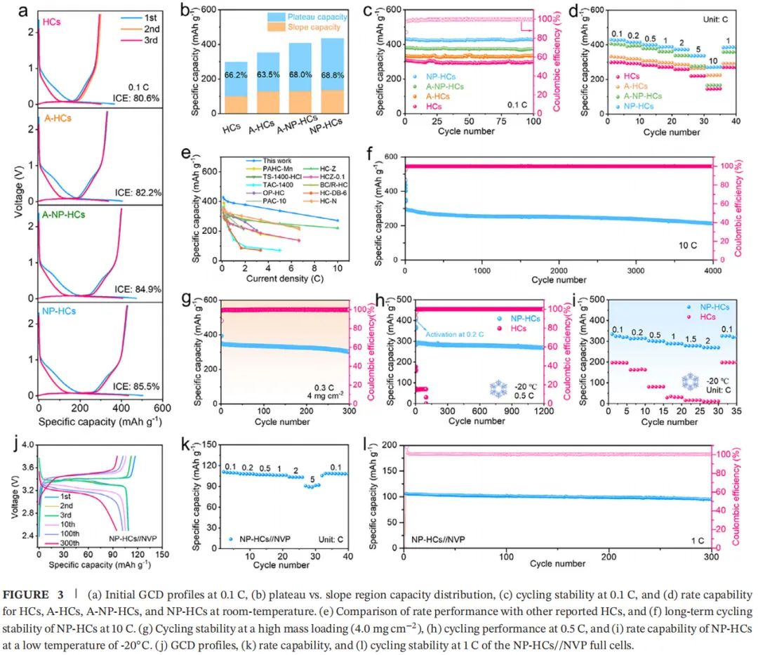 研究亮点:该策略同步“爆改”了硬碳的体相与界面!体相中造出了丰富的闭孔和超宽层间距(0.401 nm),界面上形成了有利于Na⁺快速脱溶剂化的微环境。性能极其暴躁:可逆容量高达428.8 mAh g⁻¹,10 C下仍有272.6 mAh g⁻¹,在-20℃极端低温下循环1200次容量保持率高达93.1%!