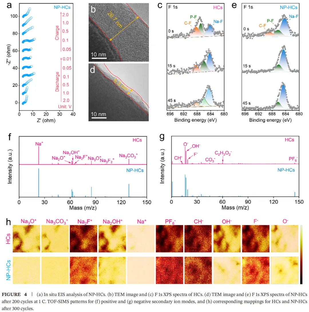 证据二(XPS与TOF-SIMS界面剖析):对SEI的“成分与形貌”进行了深度起底。结果表明,表面N/P掺杂成功诱发了电解液的催化分解,形成了一层极薄(6.31 nm)且富含无机NaF的SEI膜。这层膜就像个完美的“安检口”,阻挡了电子消耗,却让Na⁺快速通行。