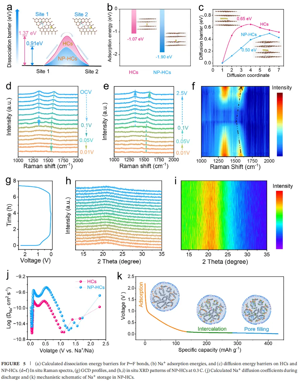 通过原位聚合策略,将富含杂原子的聚磷腈(PZS)共形包覆在杨树木粉(PW,200目)前驱体上,以调控所得NP-HCs的体相与界面钠存储环境。合成PZS包覆层过程中使用的三乙胺(TEA)发挥了双重作用:(1)促进PZS聚合,(2)从PW前驱体中提取部分木质素,调控碳化产物的微观结构。NP-HCs表现出高闭孔含量和扩大的层间距(0.401 nm)。此外,在碳化过程中,PZS包覆层原位转化为低浓度N、P元素掺杂的碳,这种独特的结构协同实现了快速的Na⁺去溶剂化、低Na⁺扩散势垒和P-F键(NaPF₆)解离能,促进了硬碳负极循环过程中形成薄且富含无机物的SEI。因此,NP-HCs展现出高可逆容量(428.8 mAh g⁻¹)和首次库仑效率(85.5%)、优异的倍率性能、以及超过4000次的循环寿命。即使在-20 °C低温条件下测试,NP-HCs仍保持优异的循环稳定性,循环1200次后(0.5 C)容量保持率高达93.1%。此外,原位/非原位光谱学表征与理论计算共同揭示了其原子尺度的钠存储机制及加速的反应动力学。