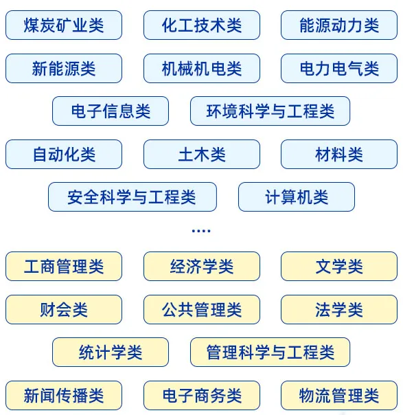 煤炭矿业类、化工技术类、能源动力类、机械机电类、新能源类、电力电气类、电子信息类、环境科学与工程类、土木类材料类自动化类、计算机类、安全科学与工程类等;
