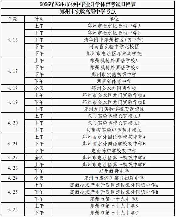 2026 郑州中招体育开考!10 大考点全公布,4.16-4.26 开考!