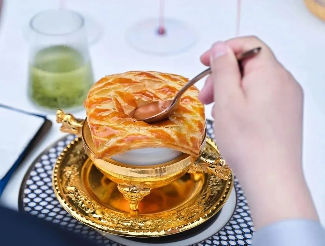 酥皮蛤蜊胡辣浓汤将太平洋蛤蜊浓汤与中原胡辣汤奇妙结合——以辛香胡辣汤为魂,融入黄油与蛤蜊、海参、鲍鱼等海味,搭配中式葱油饼,胡辣开胃,既有中原的浓郁,又有海洋的鲜美。