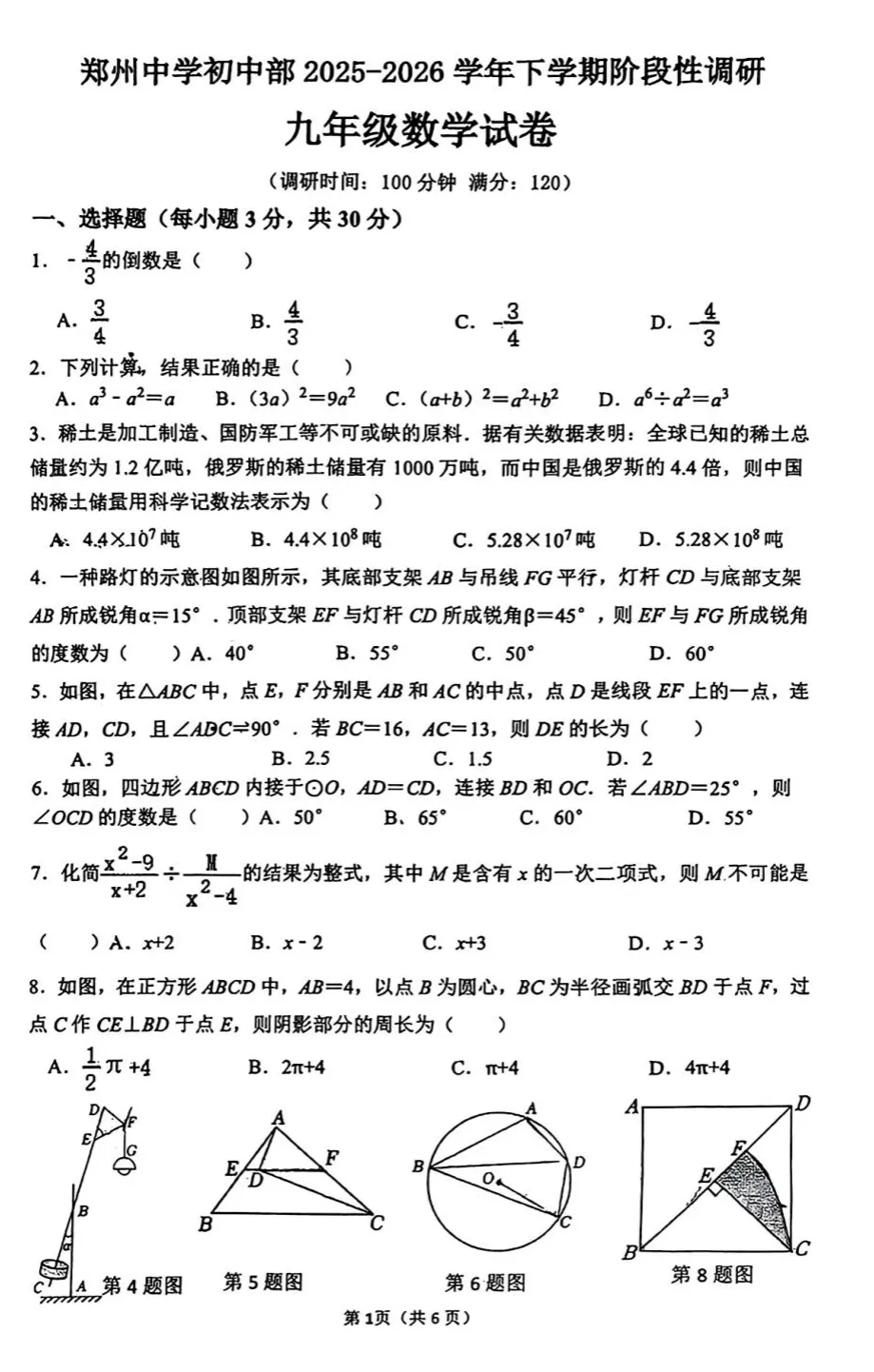 >【郑州中学模拟】2025-2026学年郑州中学初中部九年级下学期阶段性调研数学试卷