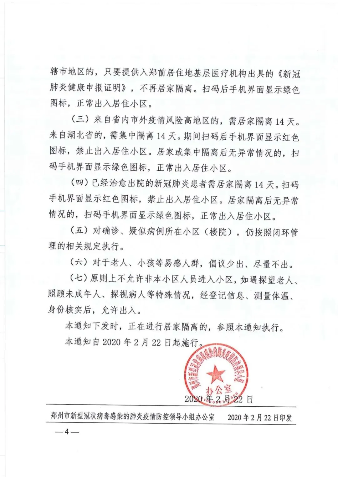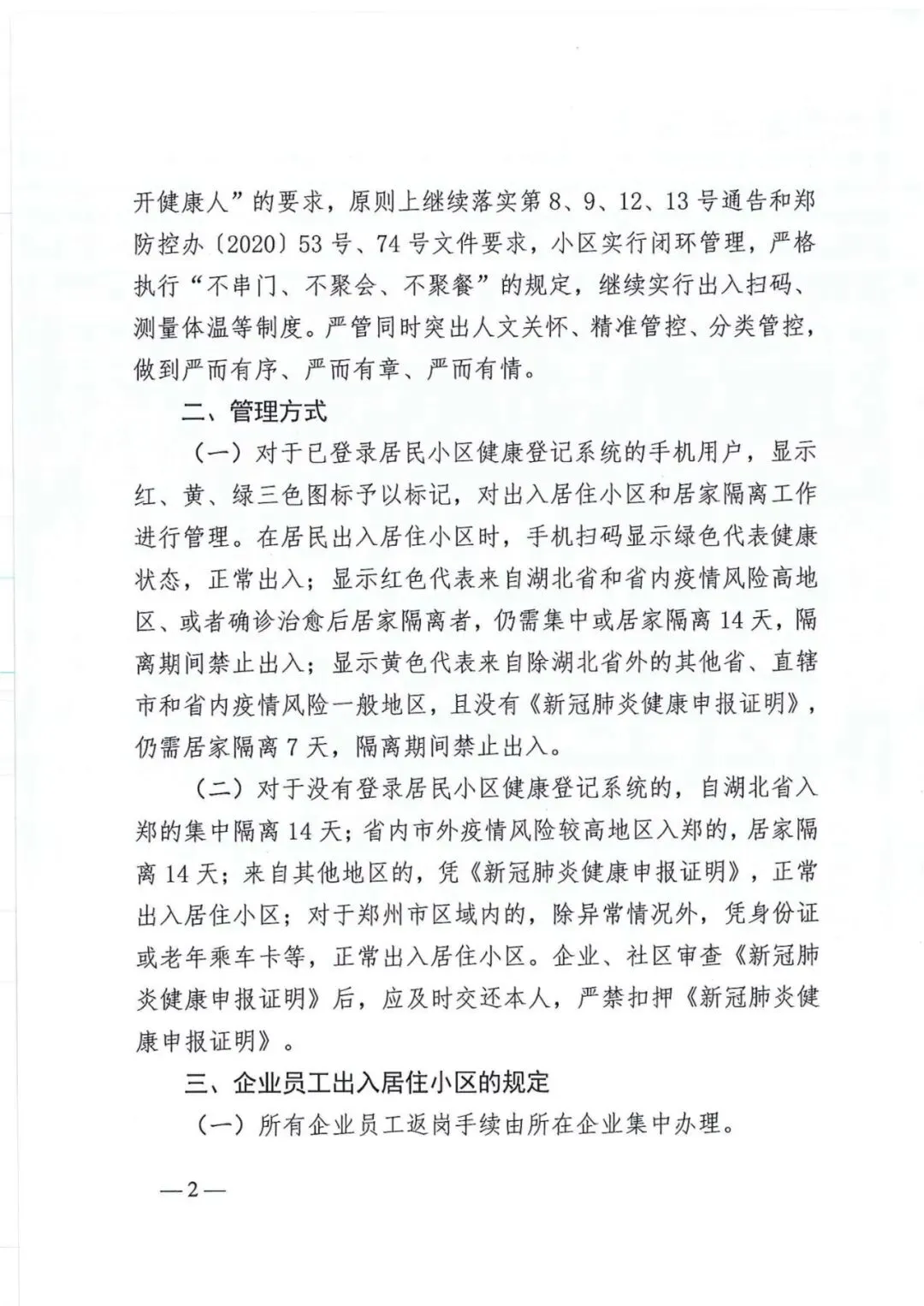 根据《通知》,原则上继续落实第8、9、12、13号通告和郑州防控办(2020)53、74号文件要求,小区实行闭环管理,严格执行“不串门、不聚会、不聚餐”的规定,继续实行出入扫码、测量体温等制度。2、未来,小区将如何管理?隔离政策是啥?