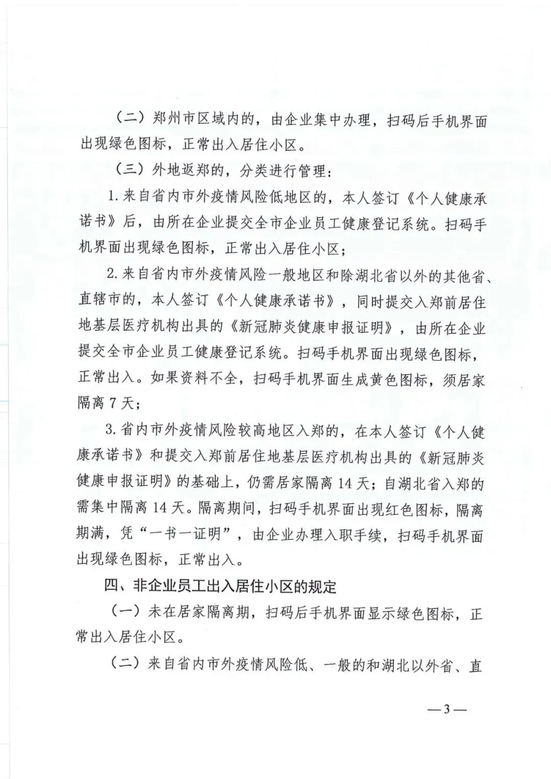 对于不少返郑上班的人来说,部分人没有在郑州登录过居民小区健康登记系统,他们该如何进出小区?《通知》要求,对于没有登录居民小区健康登记系统的,自湖北省入郑的集中隔离14天;省内市外疫情风险较高地区入郑的,居家隔离14天,来自其他地区的,凭《新冠肺炎健康申报证明》,正常出入居住小区;对于郑州市区域内的,除异常情况外,凭身份证或老年乘车卡等,正常出入居住小区。企业、社区审查《新冠肺炎健康申报证明》后,应及时交还本人,严禁扣押《新冠肺炎健康申报证明》。4、郑州本地企业员工如何出入小区?