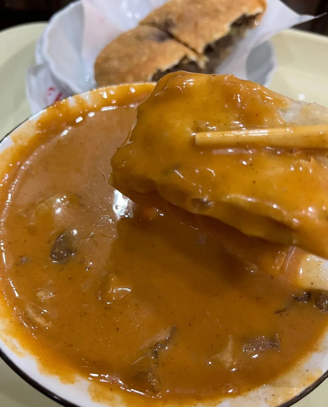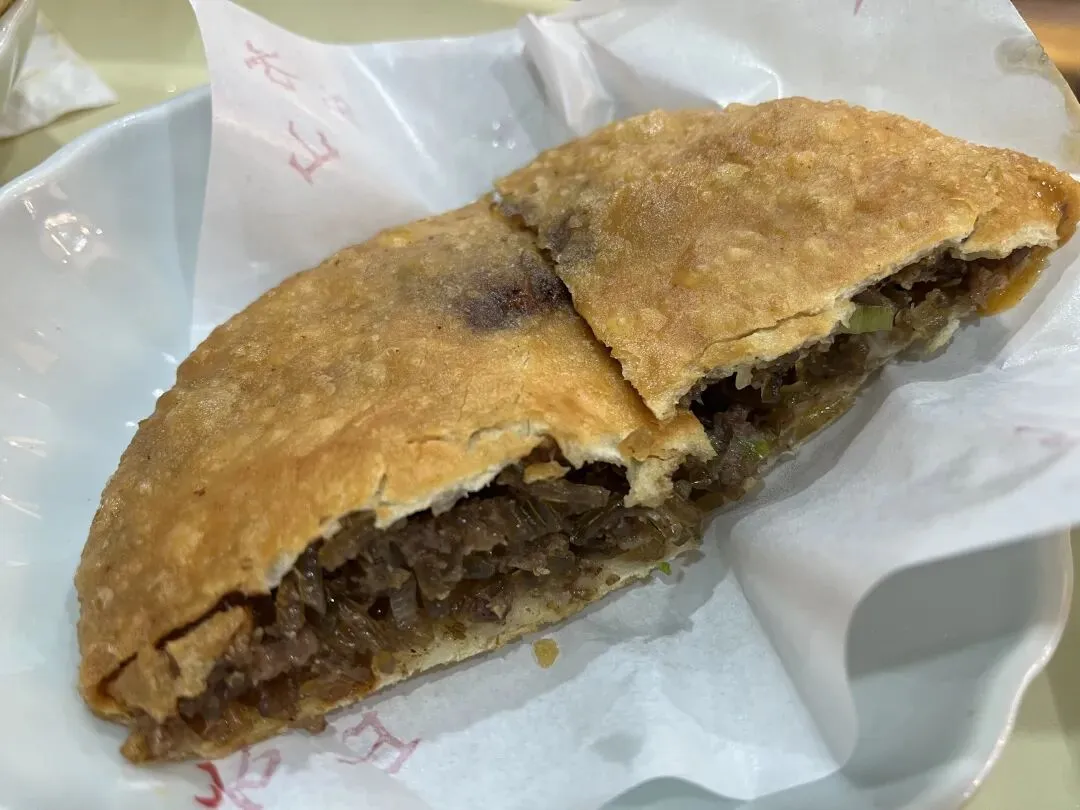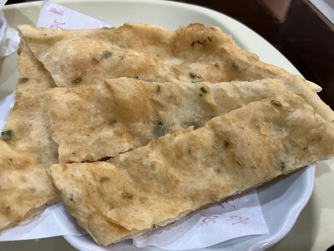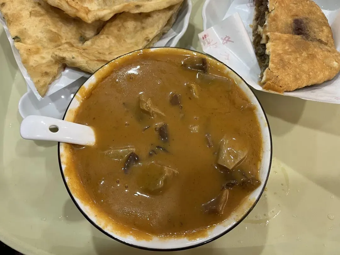推荐胡辣汤+油饼组合,刚炸好的油饼,外表酥脆、内里香软;夹一块泡进汤里,汤的辛香混合着油饼的香软,好吃极了。