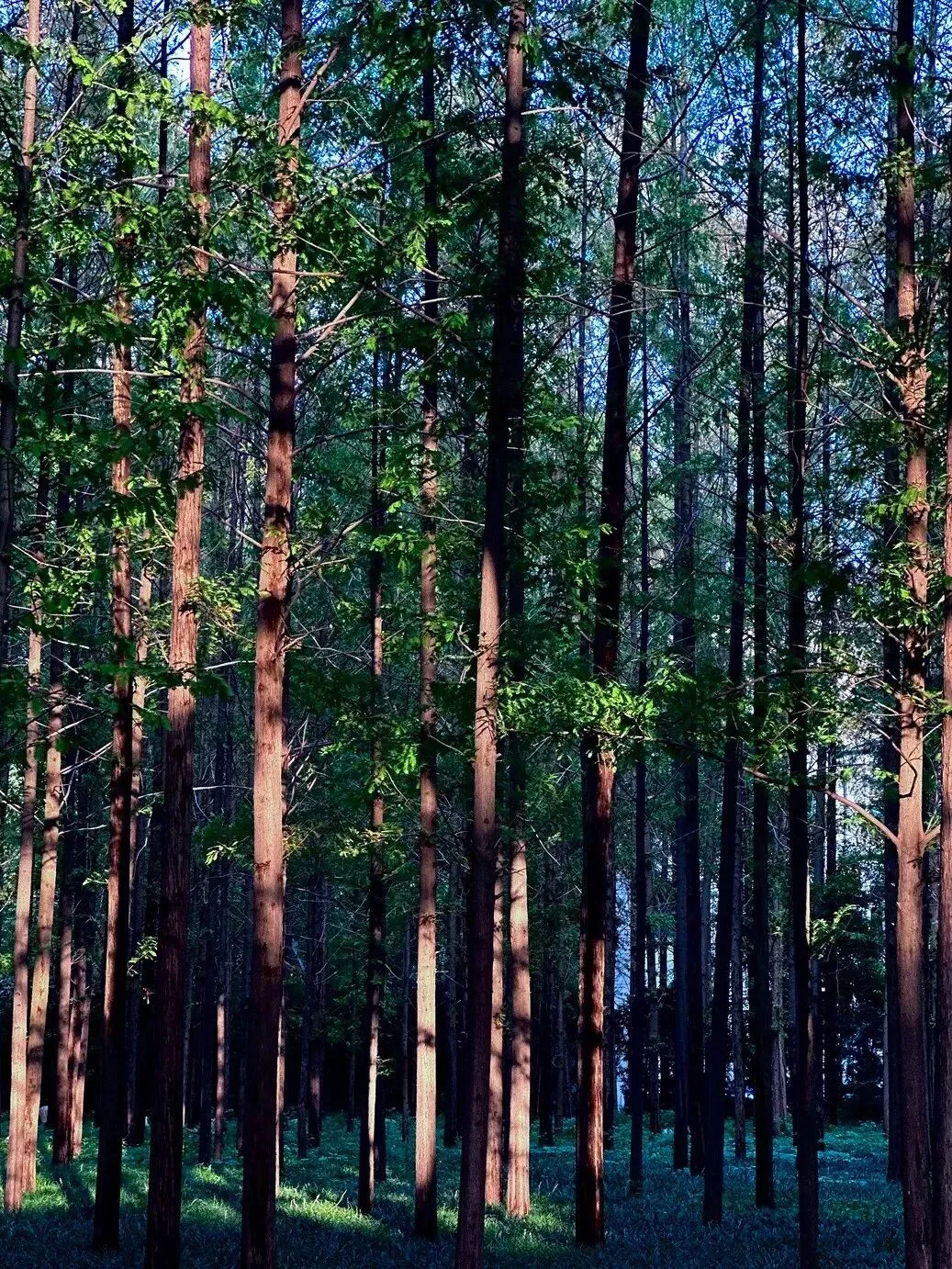 笔直参天的水杉树,整齐地排列成一道通往童话的魔法走廊。阳光从树梢筛落,穿过那些新生的、嫩得透光的绿叶,温柔地洒向地面。