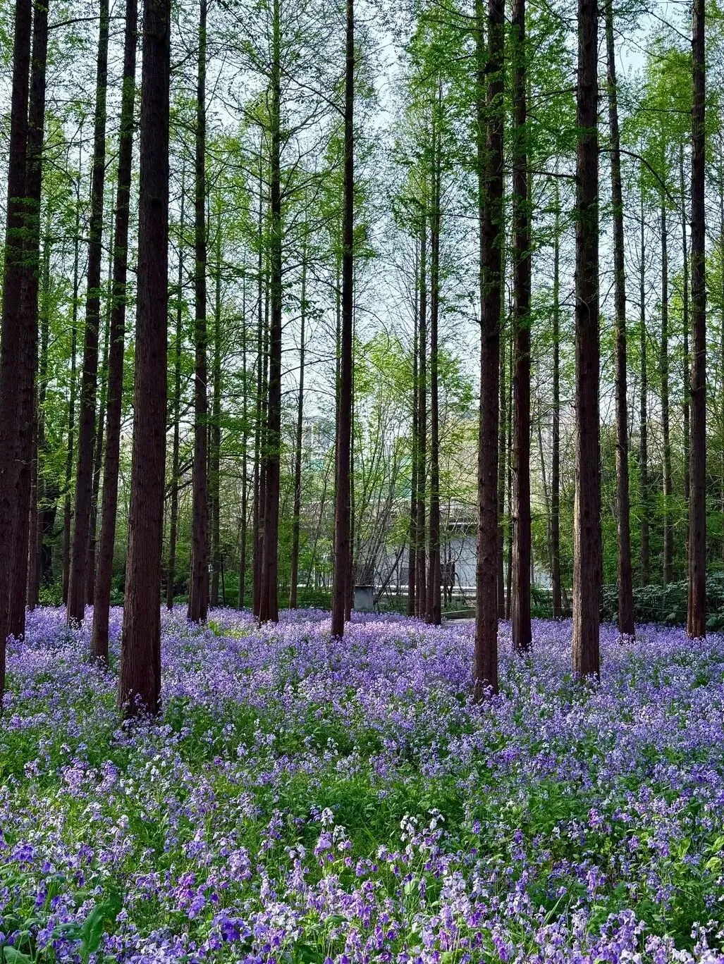 而树下,是令人屏息的、梦幻般的紫色二月兰花海,像一层柔软的绒毯,铺满了整片森林的梦境。