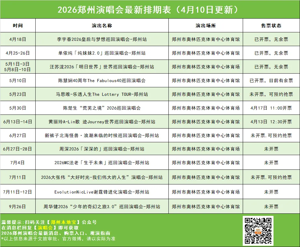 2026郑州演唱会最新排期表