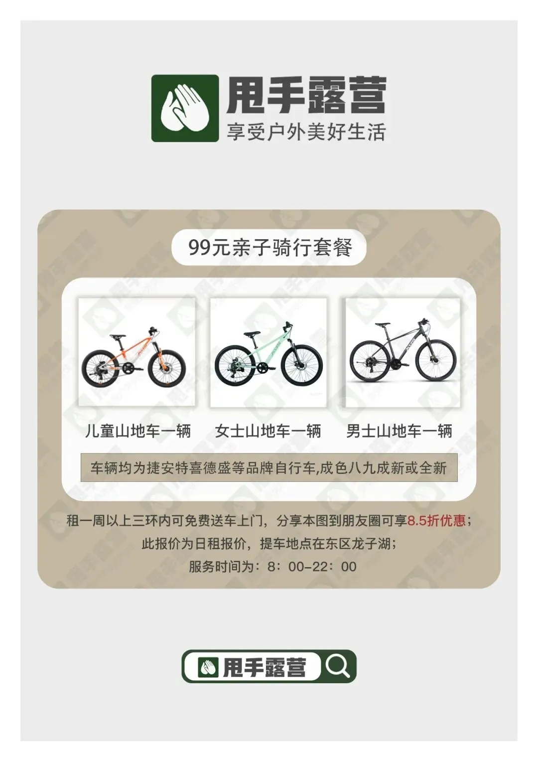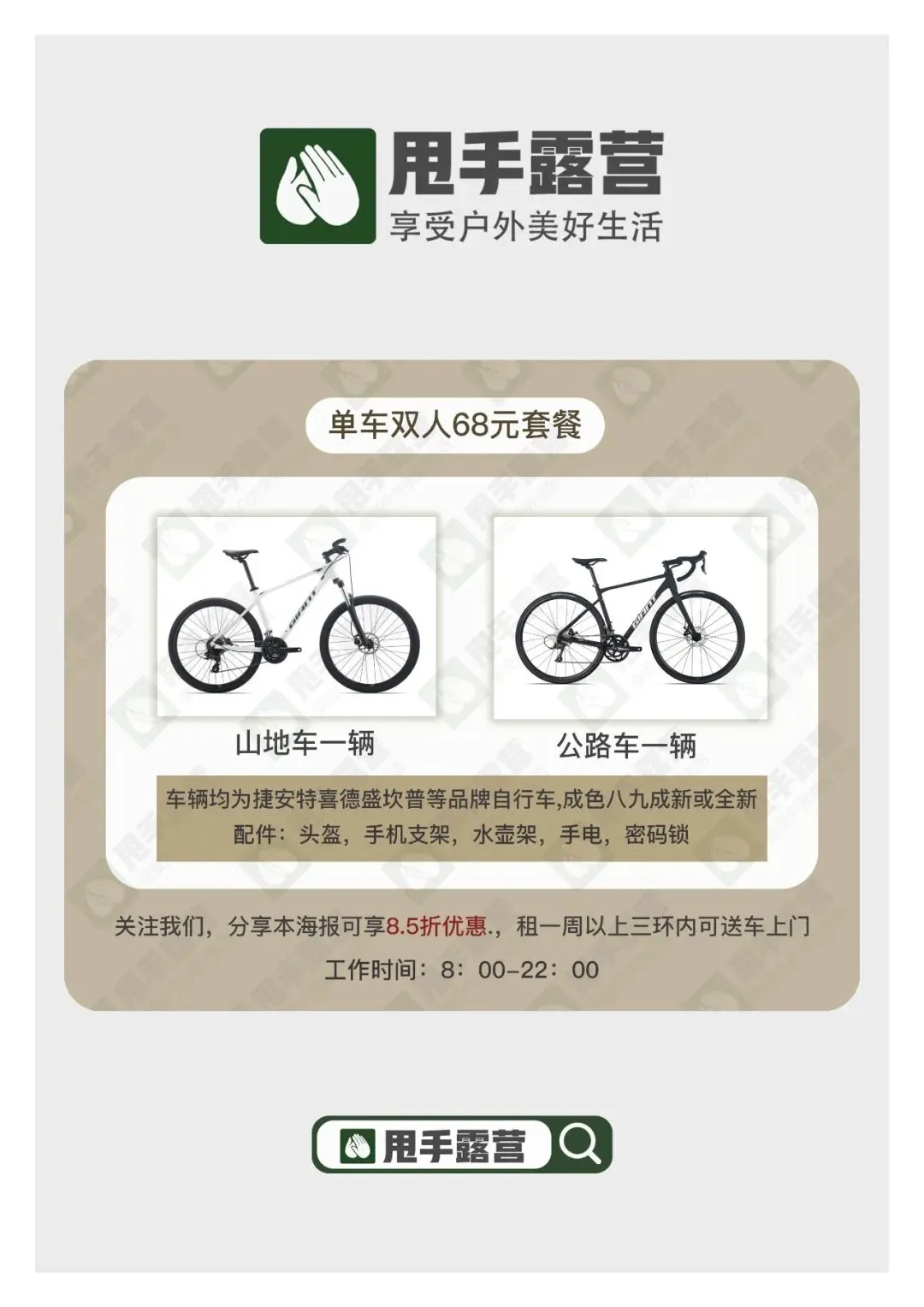不同品牌与不同车辆型号租金价格不同,甩手露营山地车租金最低26元一天,公路车最低38元一天;有需求可加181 0371 0448 告知性别与身高,这边可匹配合适车辆!