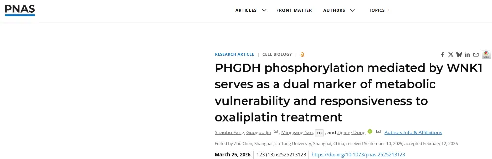 代谢重编程是癌症进展的核心特征,而丝氨酸代谢在胃癌发生发展及化疗耐药中的作用长期未明。针对这一难题,郑州大学董子钢等团队在《美国科学院院刊》(PNAS)发表研究,首次揭示无赖氨酸激酶1(WNK1)介导的PHGDH磷酸化是调控胃癌丝氨酸代谢重编程、驱动奥沙利铂耐药的关键机制,并为化疗响应预测提供了新型生物标志物。研究通过整合多组学分析与功能验证,为胃癌精准治疗开辟了新方向。
