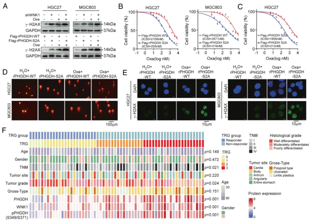 研究通过代谢组学与13C标记代谢通量分析,发现胃癌组织丝氨酸水平显著升高,其合成主要依赖限速酶PHGDH的异常激活。机制上,团队鉴定出WNK1是PHGDH的上游激酶,可在其ASB结构域的Ser349和Ser371位点进行磷酸化修饰。该修饰不仅增强PHGDH催化活性,还通过阻断E3泛素连接酶UHRF2介导的泛素化降解,提升蛋白稳定性。体内实验显示,WNK1基因敲除小鼠胃部肿瘤负荷显著降低,伴随丝氨酸水平下降与氧化还原失衡;临床样本分析进一步证实,PHGDH活性、丝氨酸及谷胱甘肽(GSH)丰度与奥沙利铂耐药呈正相关,非响应者肿瘤组织中p-PHGDH(S349/S371)水平显著更高。这表明WNK1-PHGDH轴通过促进丝氨酸合成、维持GSH/GPX4抗氧化系统,帮助癌细胞逃避氧化应激与化疗杀伤。