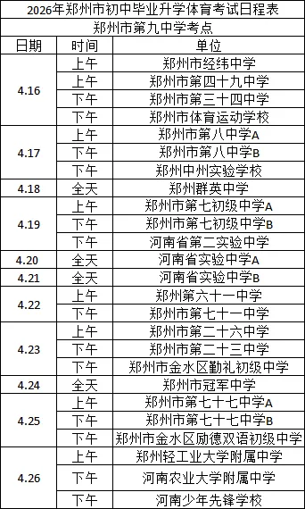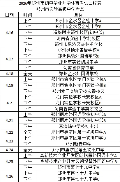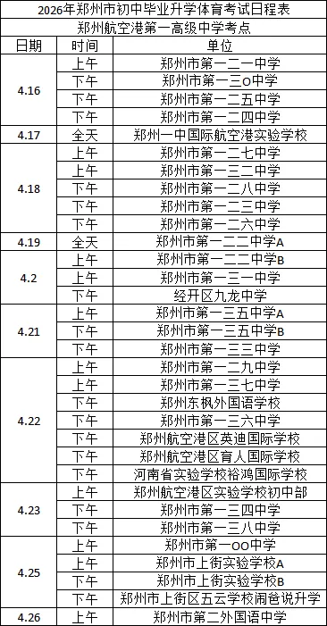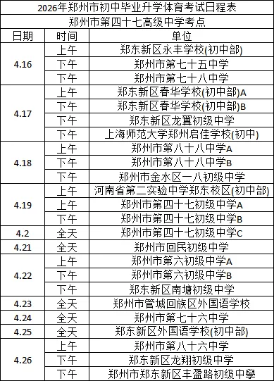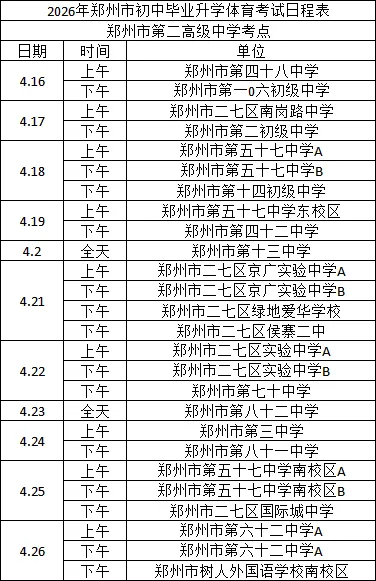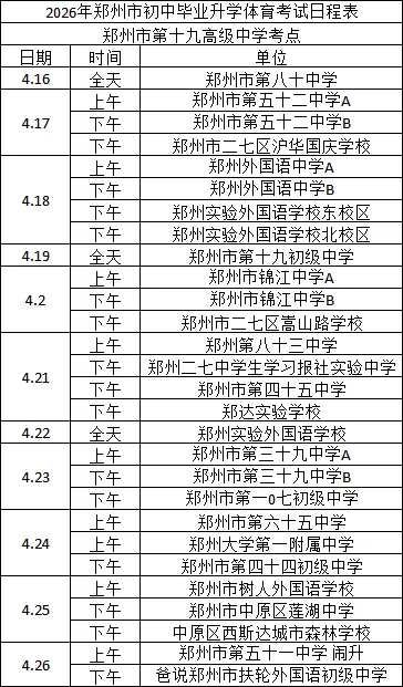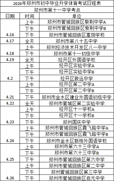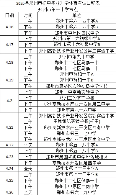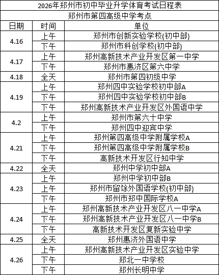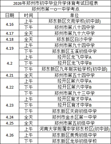 >2026年郑州市初中毕业升学体育考试日程表及考点安排