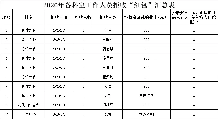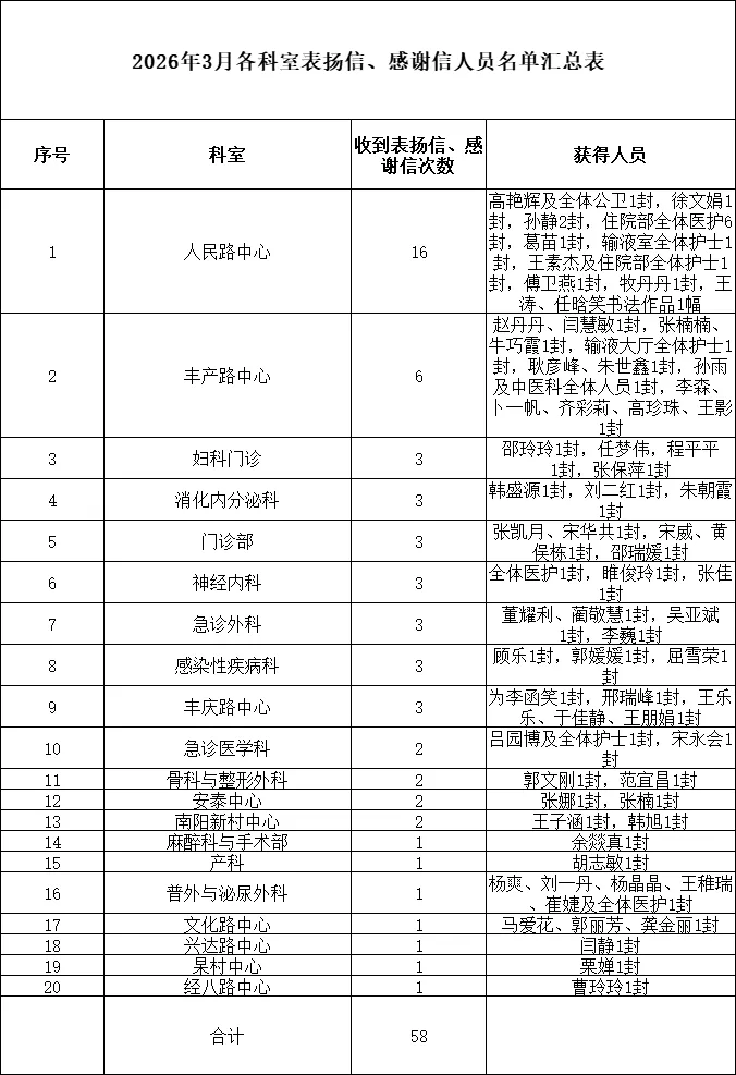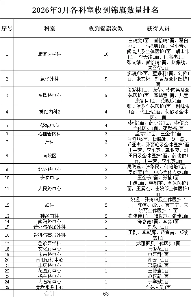 2026年3月我院收到锦旗63面,表扬、感谢信共58封,拒收红包10次。