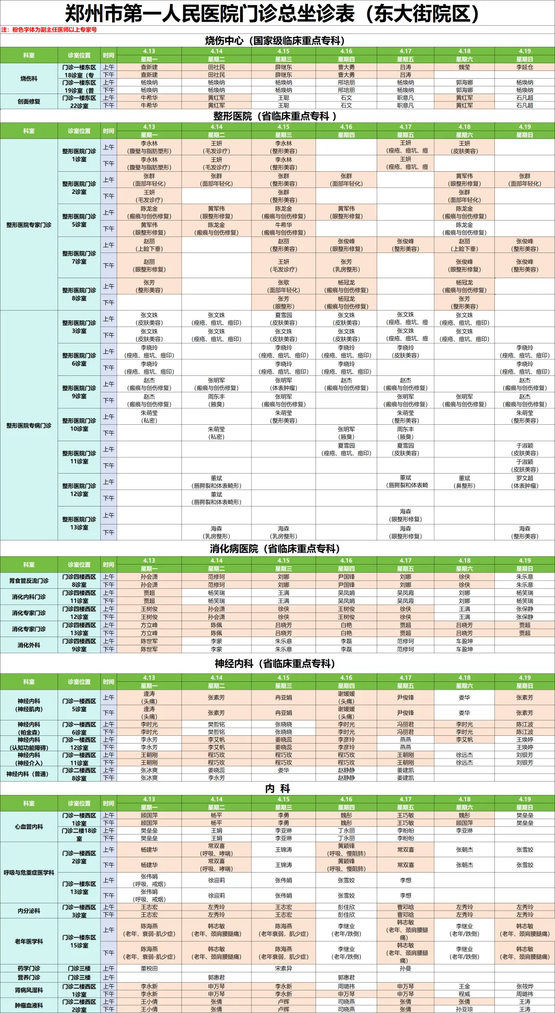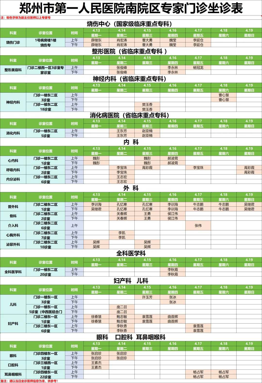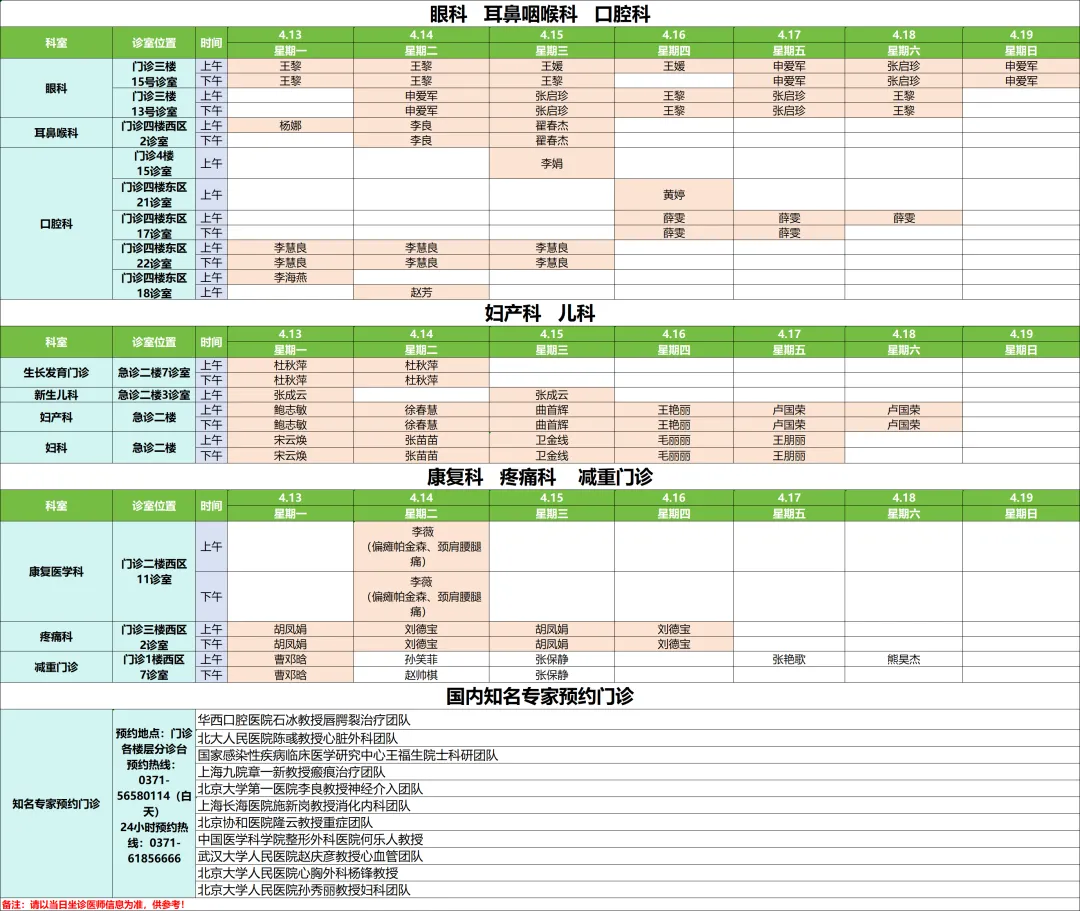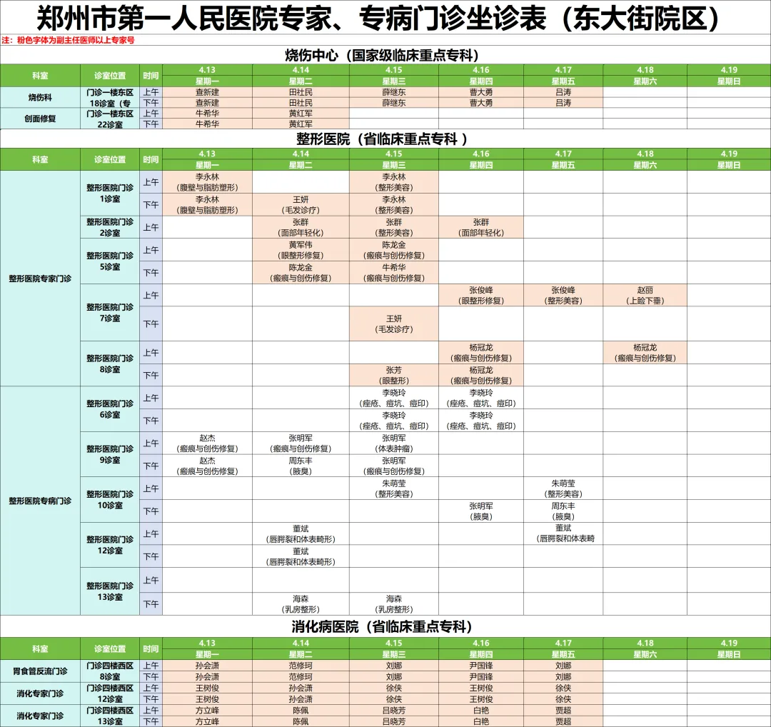 下周专家门诊出诊速览:郑州市第一人民医院、南院区4月13日—4月19日专家门诊医师排班表