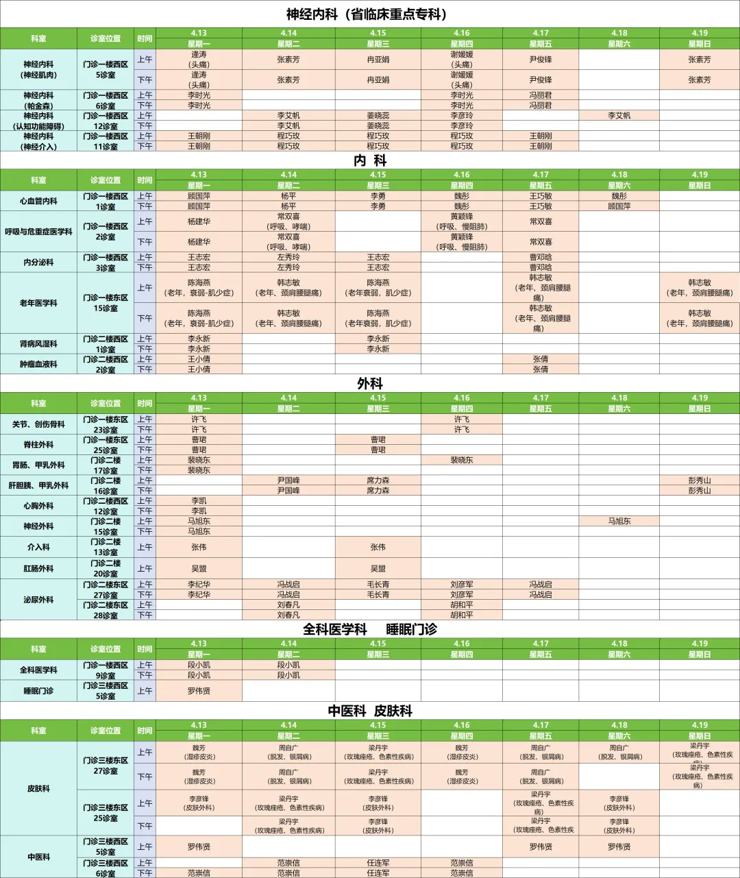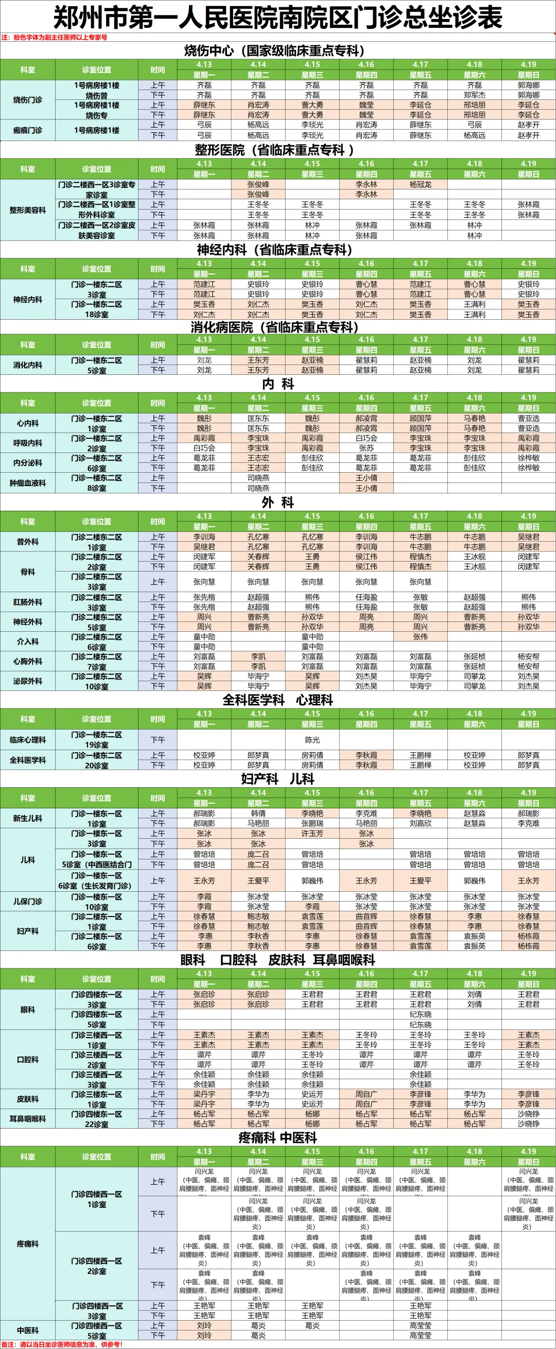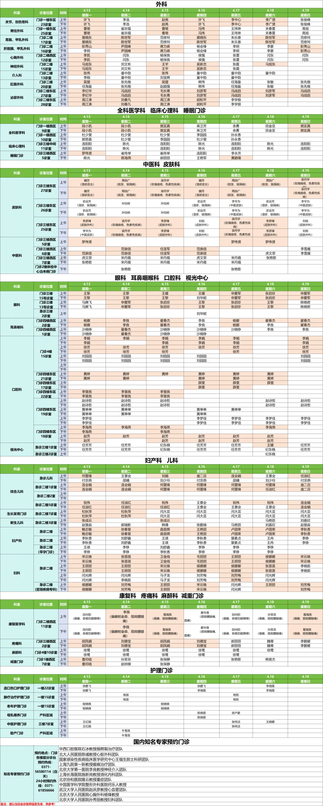 下周专家门诊出诊速览:郑州市第一人民医院、南院区4月13日—4月19日专家门诊医师排班表