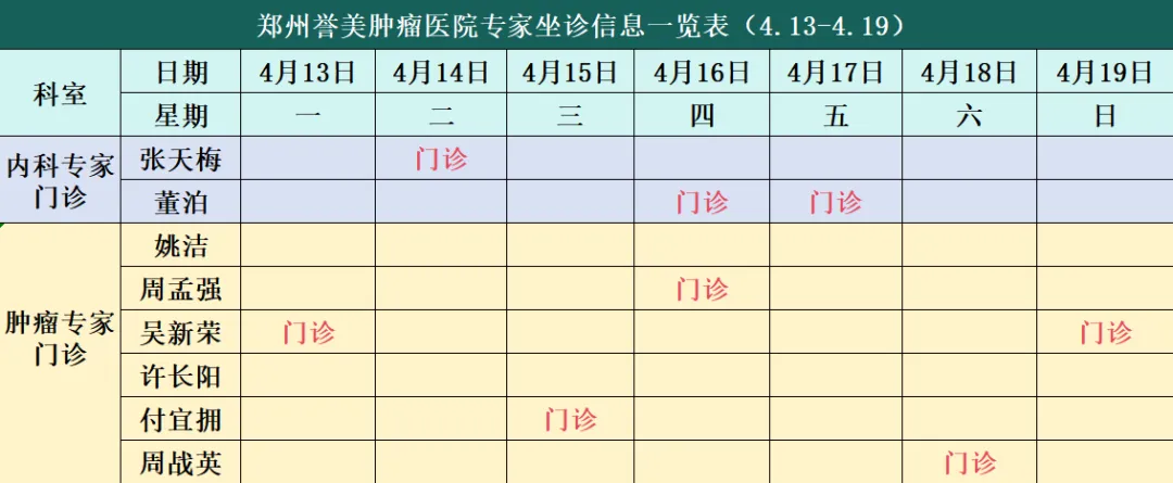 【本周专家预告】郑州誉美肿瘤医院4月13日-4月19日专家坐诊安排来啦!