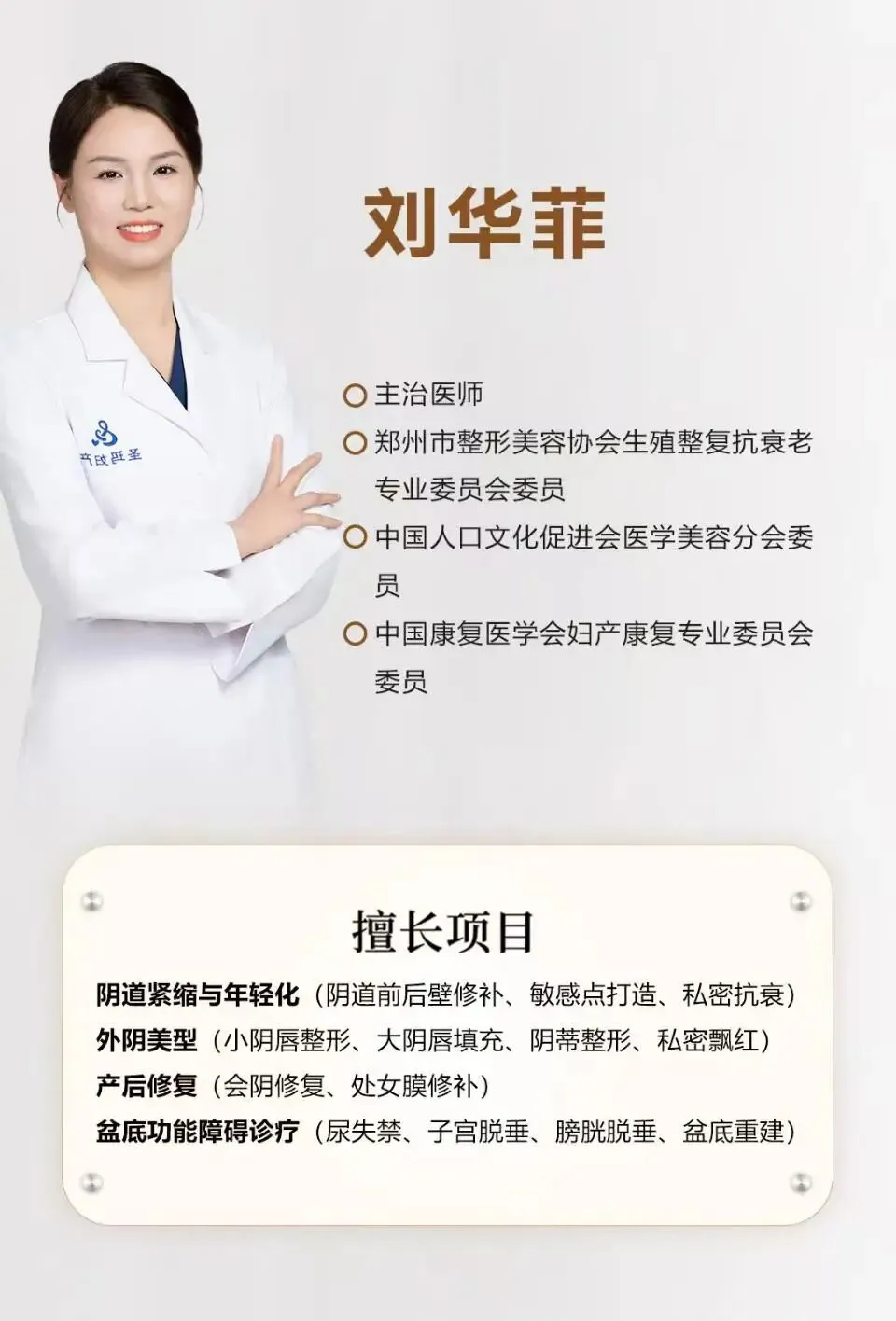 刘华菲主任深耕女性生殖整形、私密抗衰及盆底功能康复领域十余年,曾任职北京友好医院,进修于河南省人民医院,具有深厚的专业积淀、卓越的审美素养和精湛的手术技艺,其临床经验多次在专业学术会议上进行交流,深受同行推崇与女性朋友信赖,诊疗中始终秉持“功能重建与美学形态并重”的个性化治疗理念,将医疗技术与整复美学深度融合,在女性外阴形态美学重塑、阴道紧缩术、私密部位光电与整复治疗等方面拥有深厚造诣。