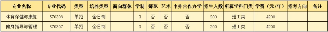 4.体育保健与康复专业、健身指导与管理专业,一共计划录取400人,这两个专业之间可兼报,按成绩从高到低依次择优录取。