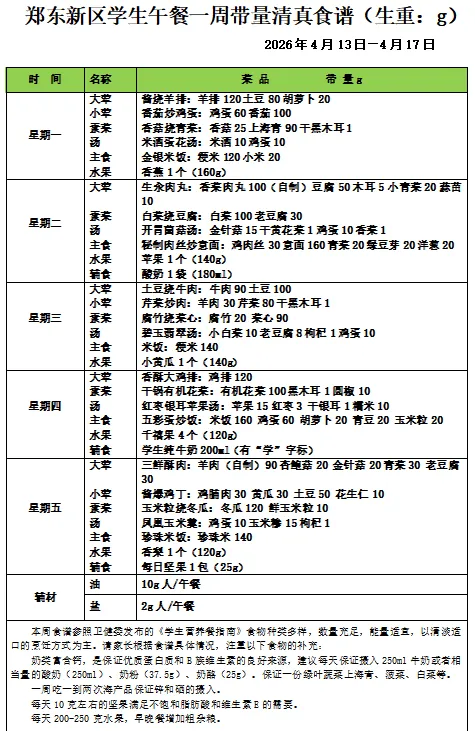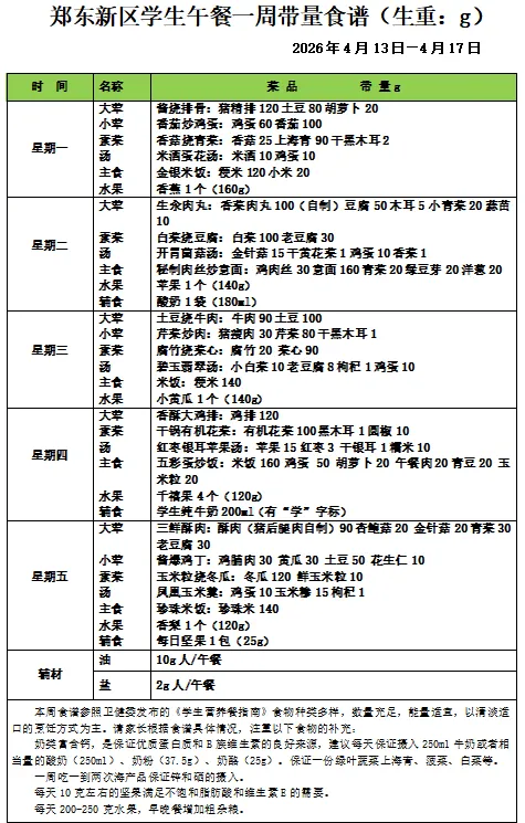 >郑州市郑东新区畅和街小学午餐一周(4月13日——4月17日)食谱