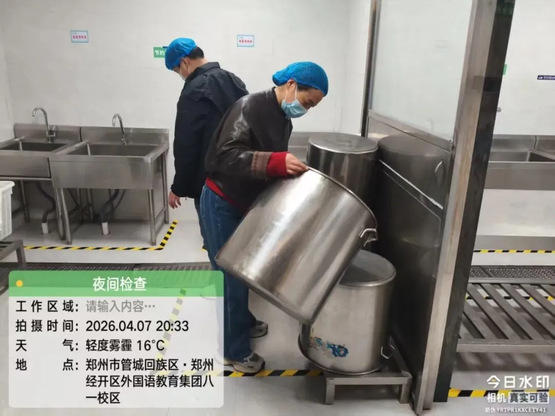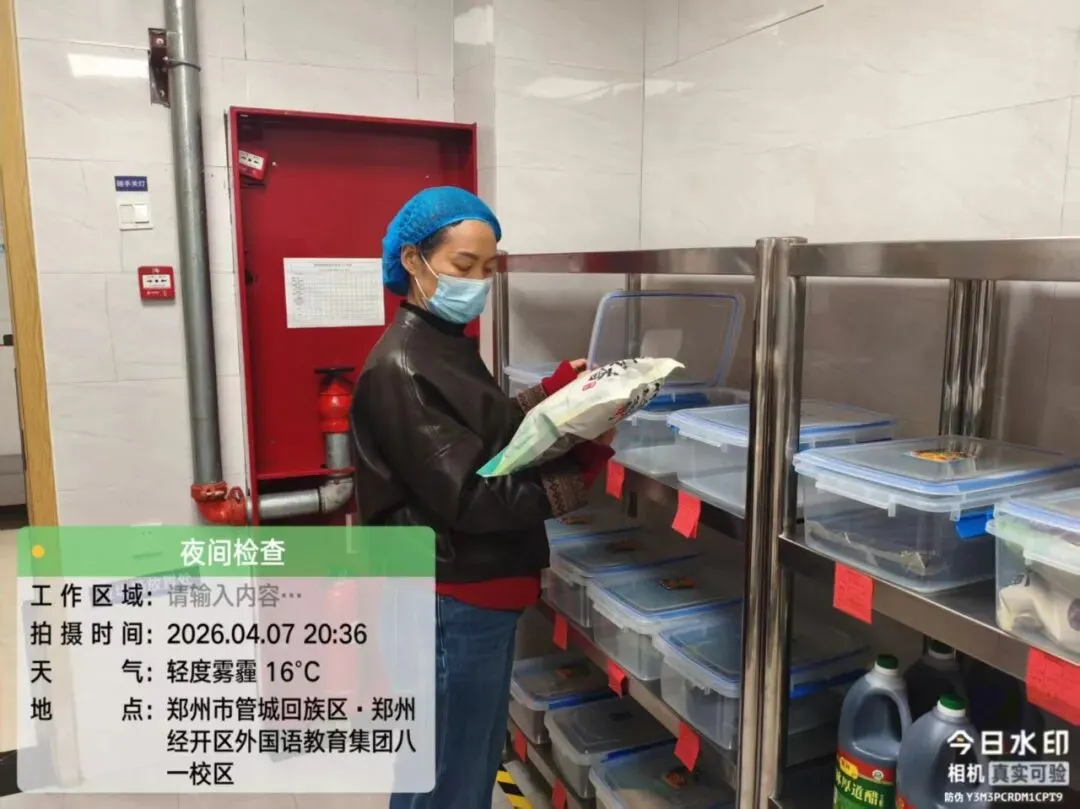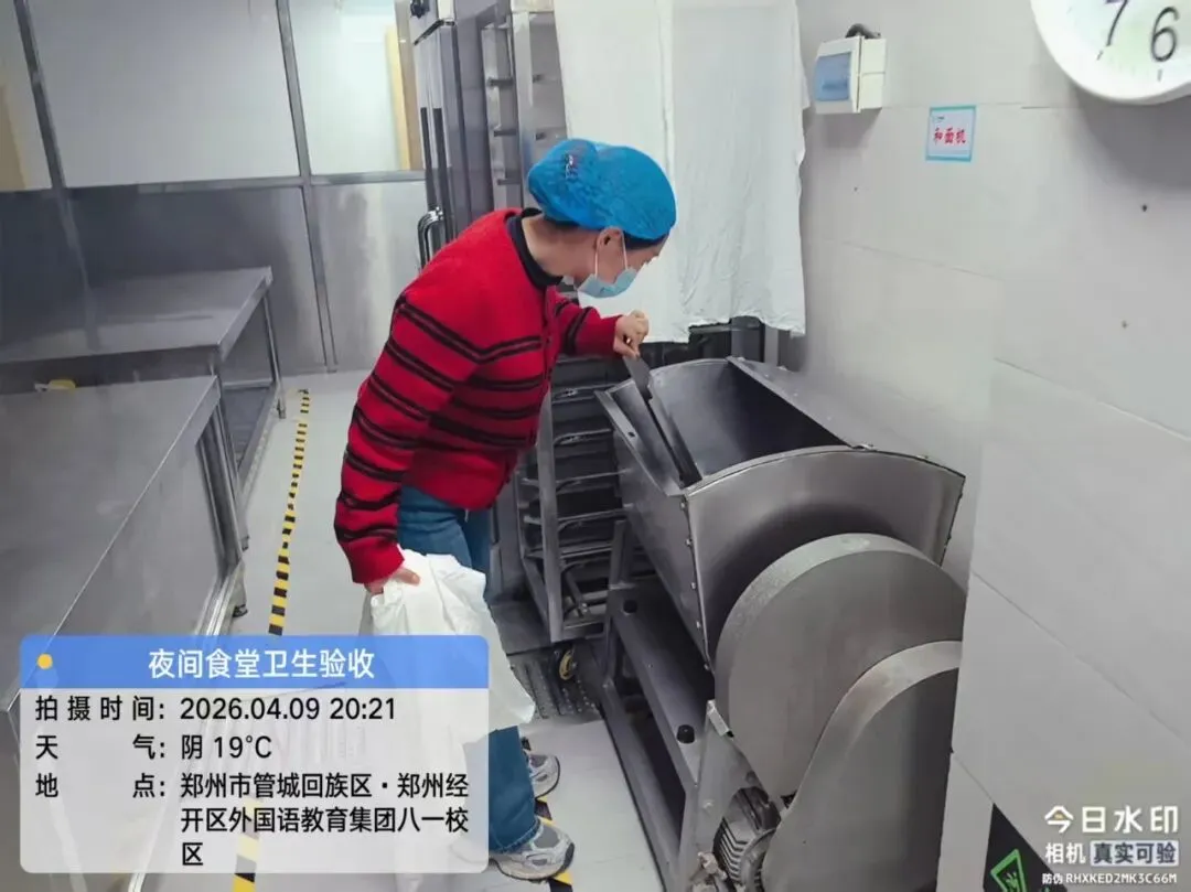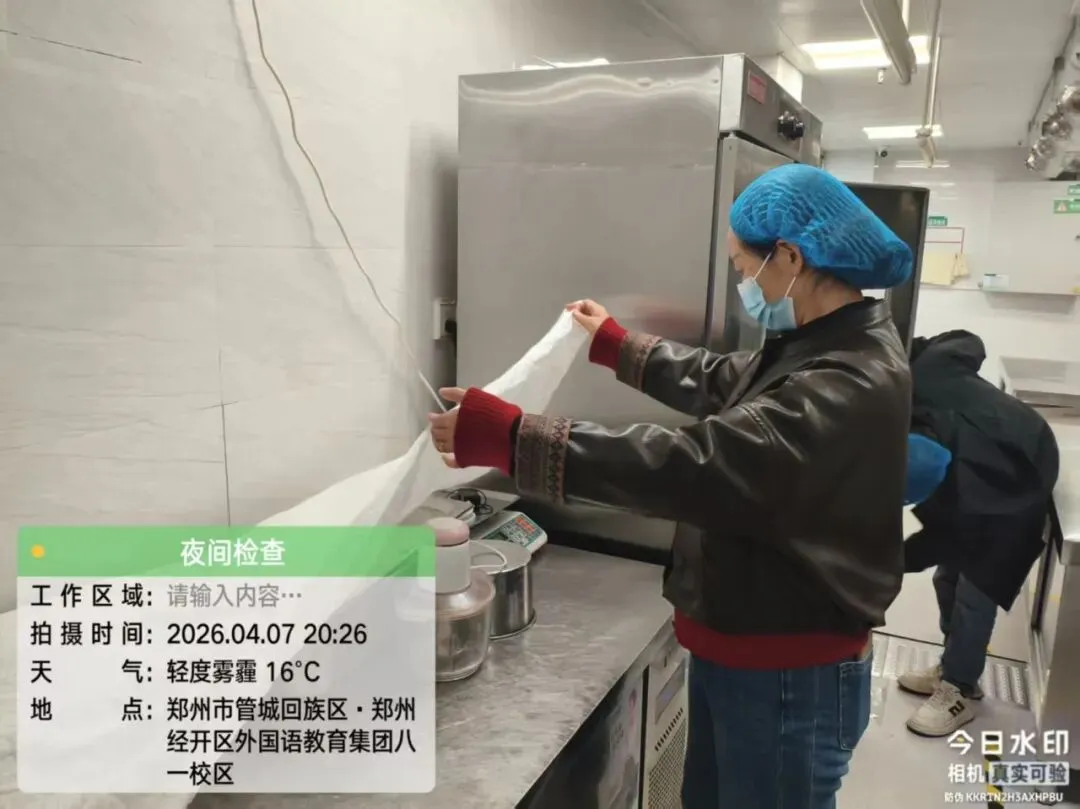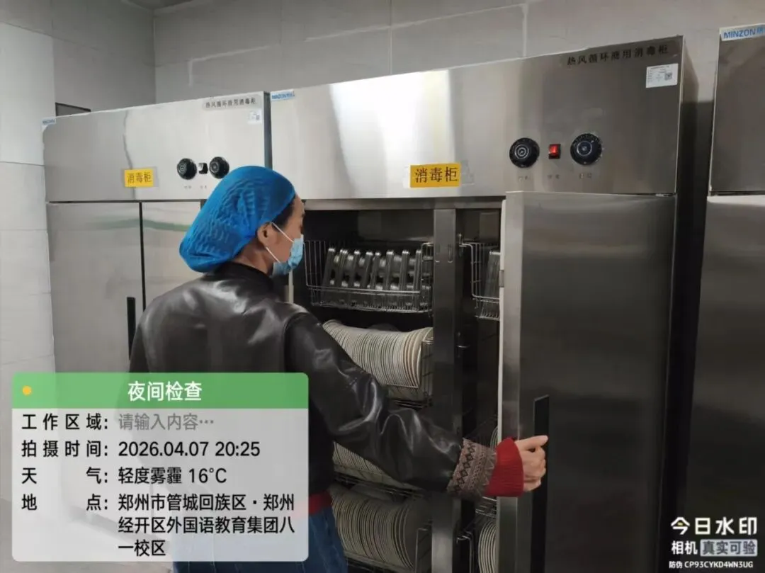 每天晚上9:00校级领导带领总务处人员和食堂从业人员对食堂卫生环境进行检查,三餐前对每样食品留样,为师生就餐保驾护航。